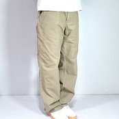 ・極太のベルトループとハンマーループ、レザーピスネーム、合わせやすいベージュでトップスの色を選ばない万能なカラーリング