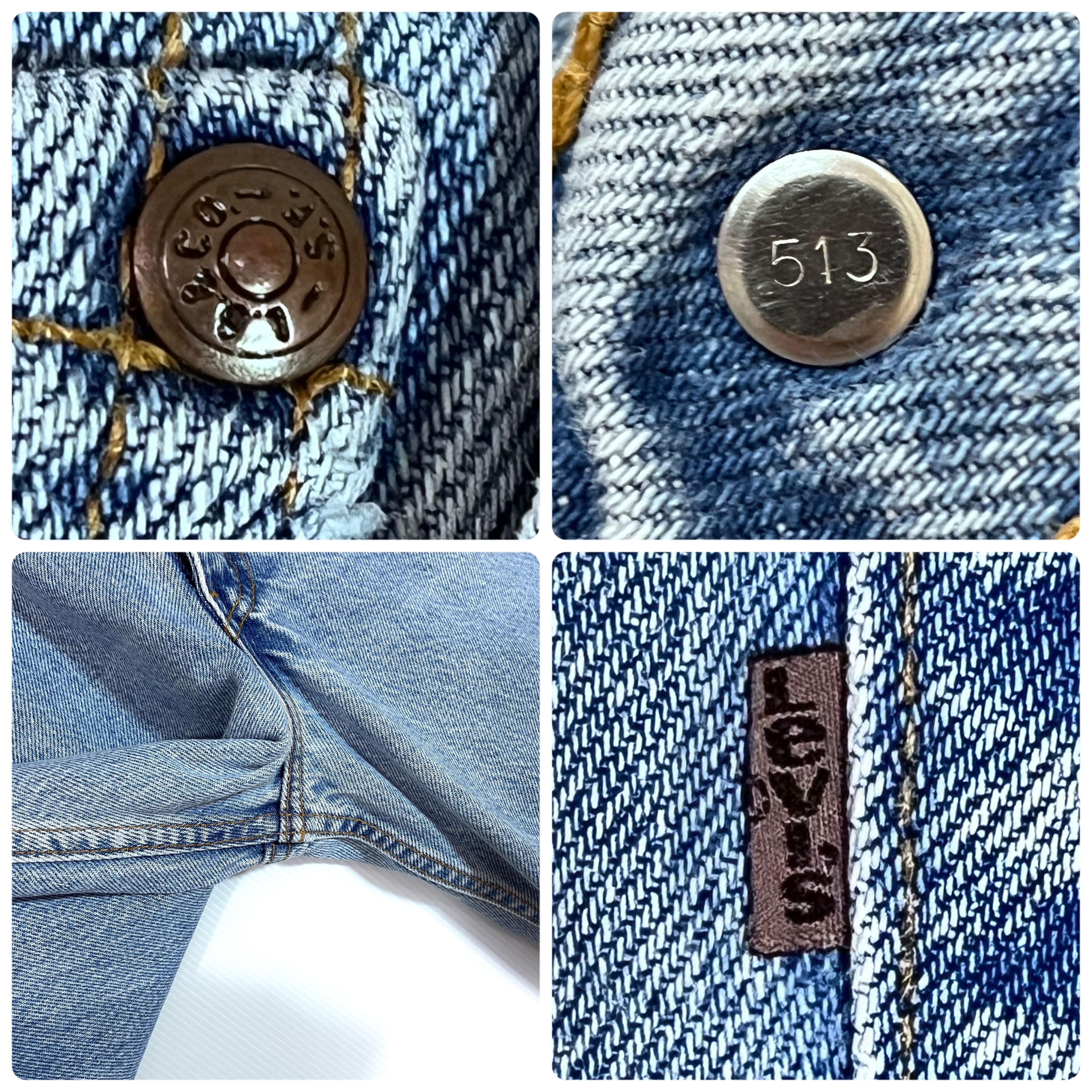 ・ 1999年4月USA製、トップボタン裏番号513、Levi’sフロントジップ、ブラウンタブ、合皮レザーパッチ(表面が剥げてフェルトが出てきています)、ドーム状のリベット