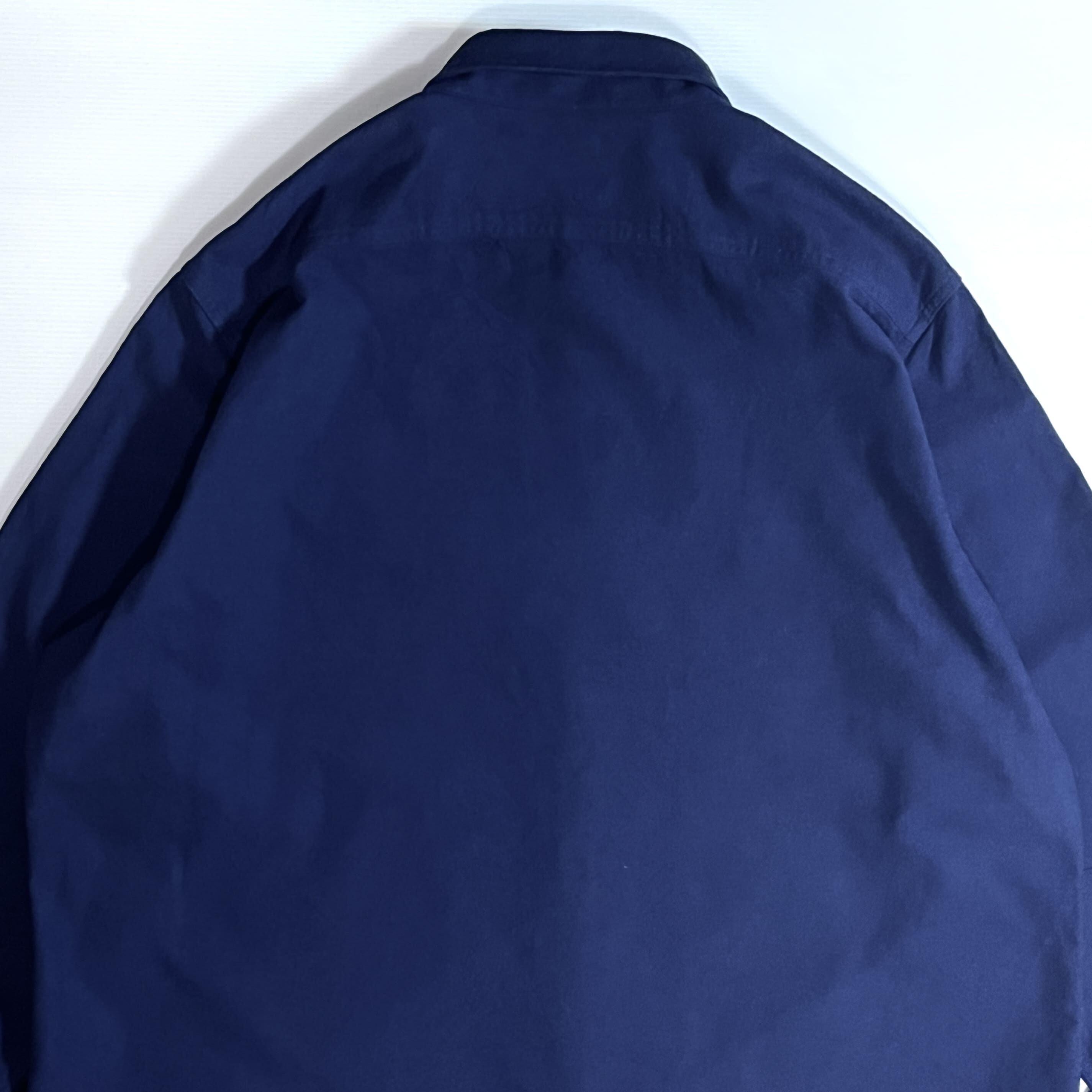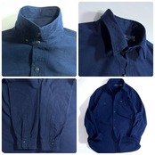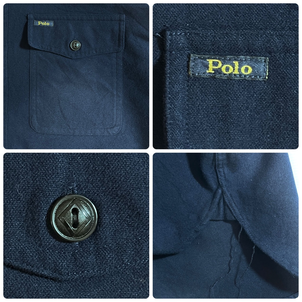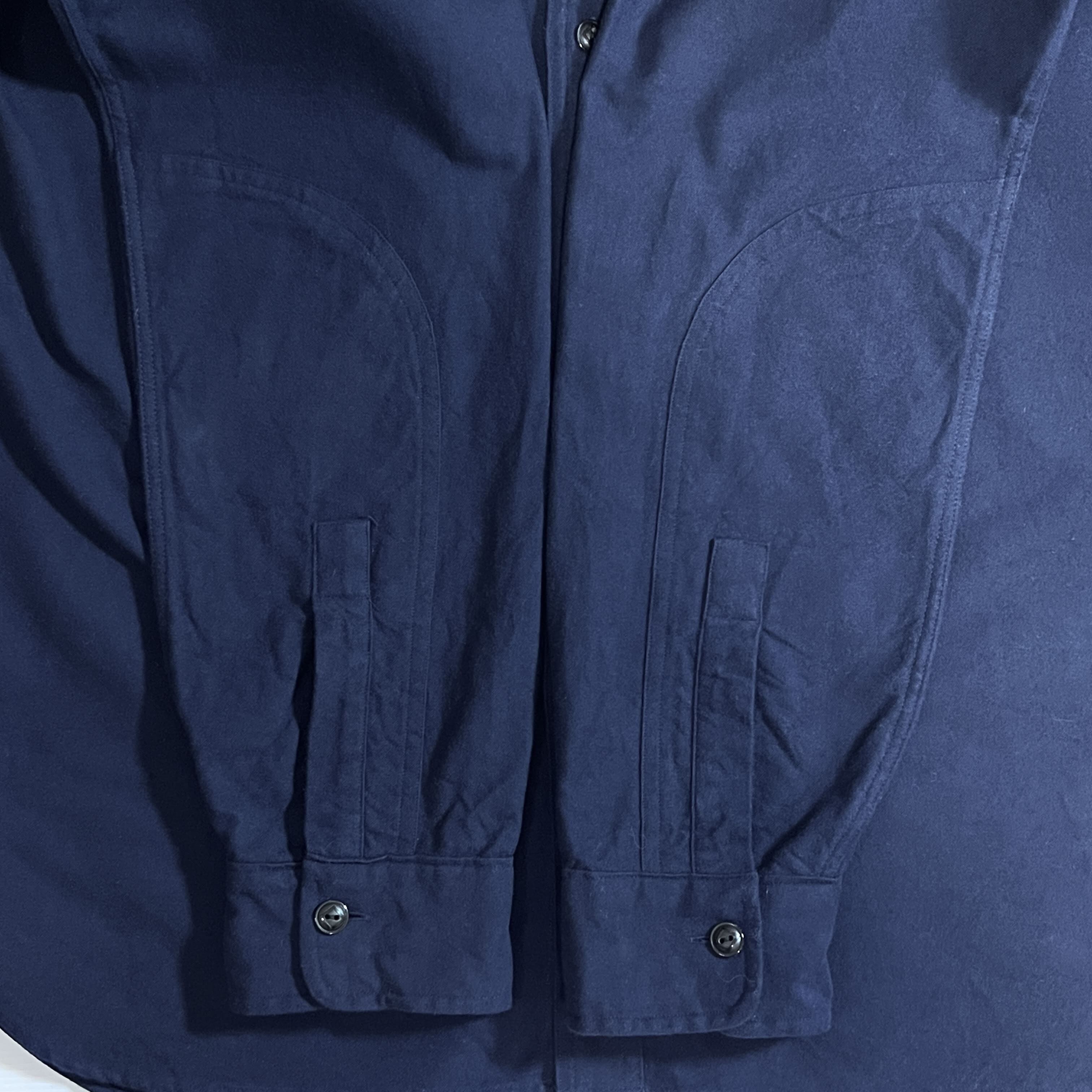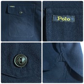 ・チンストラップ付きのトップボタン、ブラックでひし形の刻印入り猫目のダイヤボタン、ワンポイントピスネーム刺繍ロゴのフラップポケット、二重仕様の袖回り、糸の垂れたマチ付き、近年もののアイテムですがヴィンテージのワークシャツに見られるディティールをしっかり取り入れたラルフローレンらしい上位モデルの一枚です