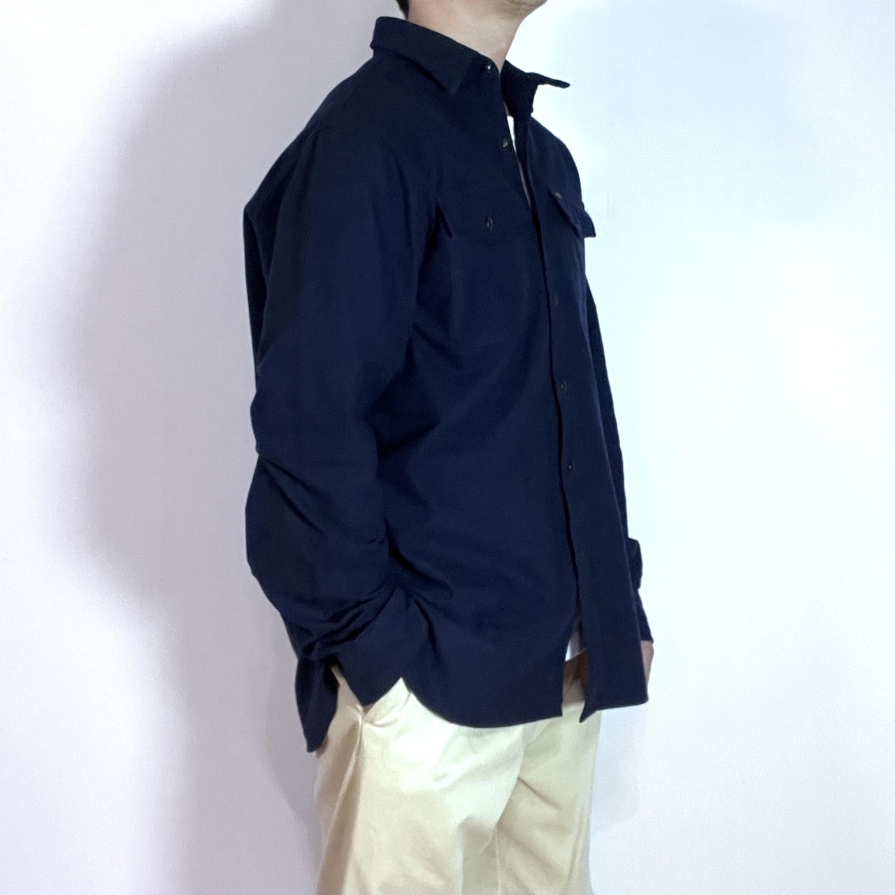 ・厚手でやや起毛したシャモアのような柔らかい肌触りのコットンフランネル素材、春先や秋口はライトアウターとして使い勝手の良いワークシャツです