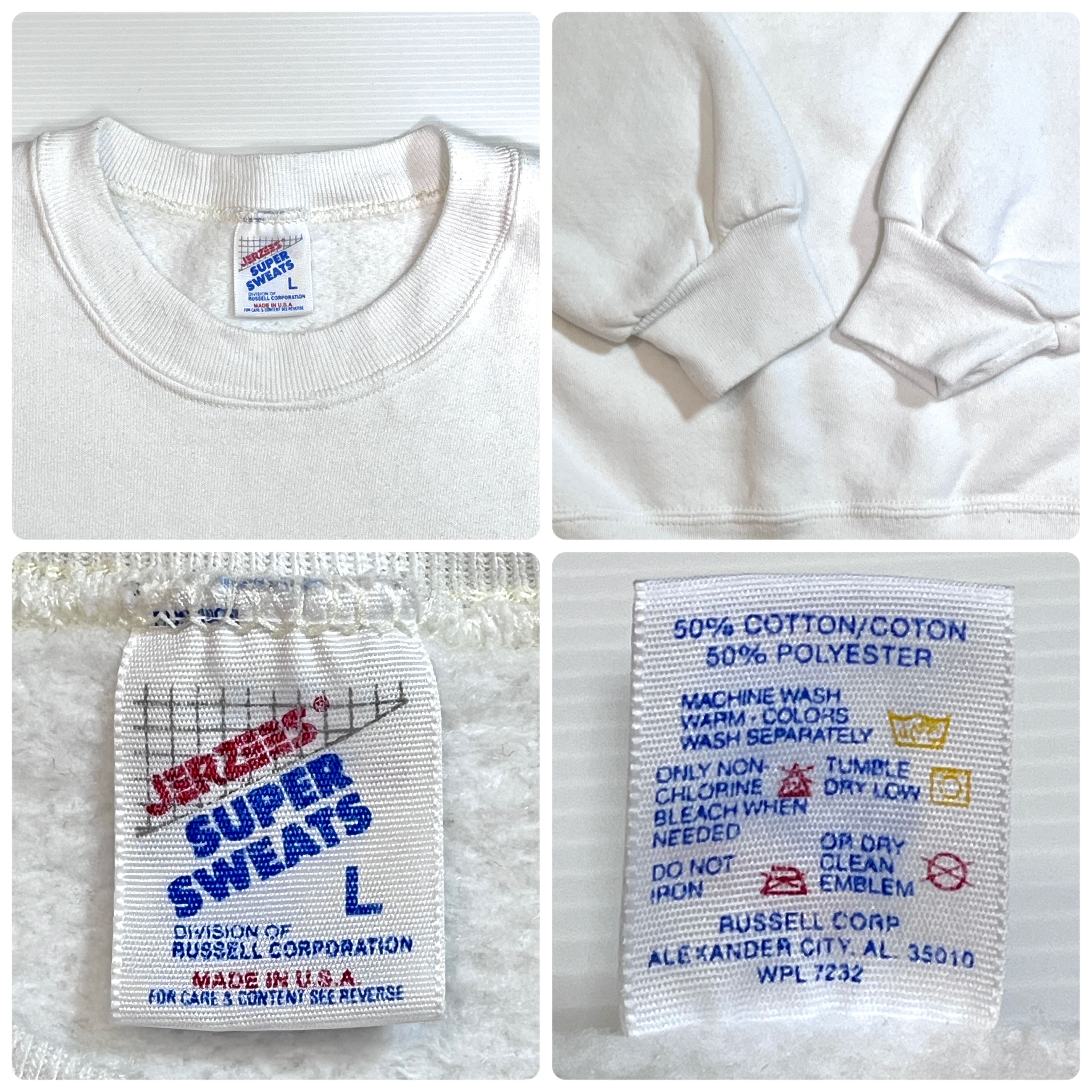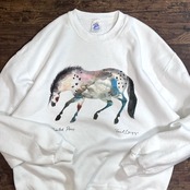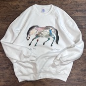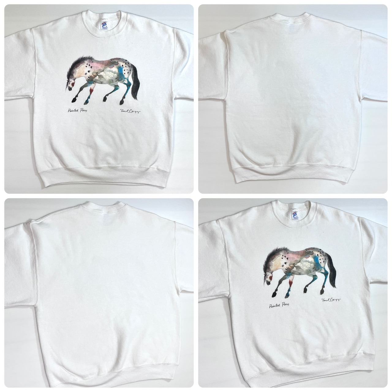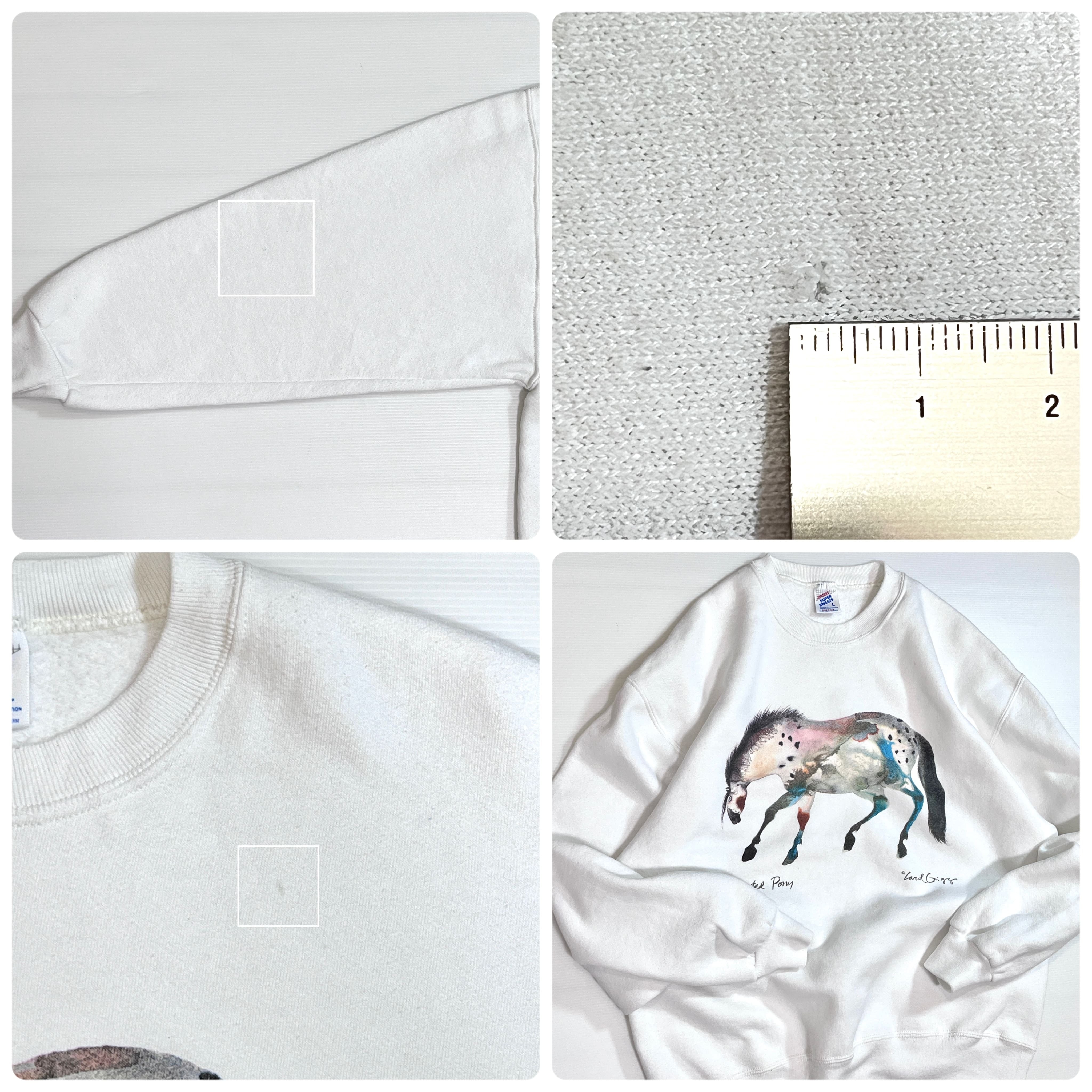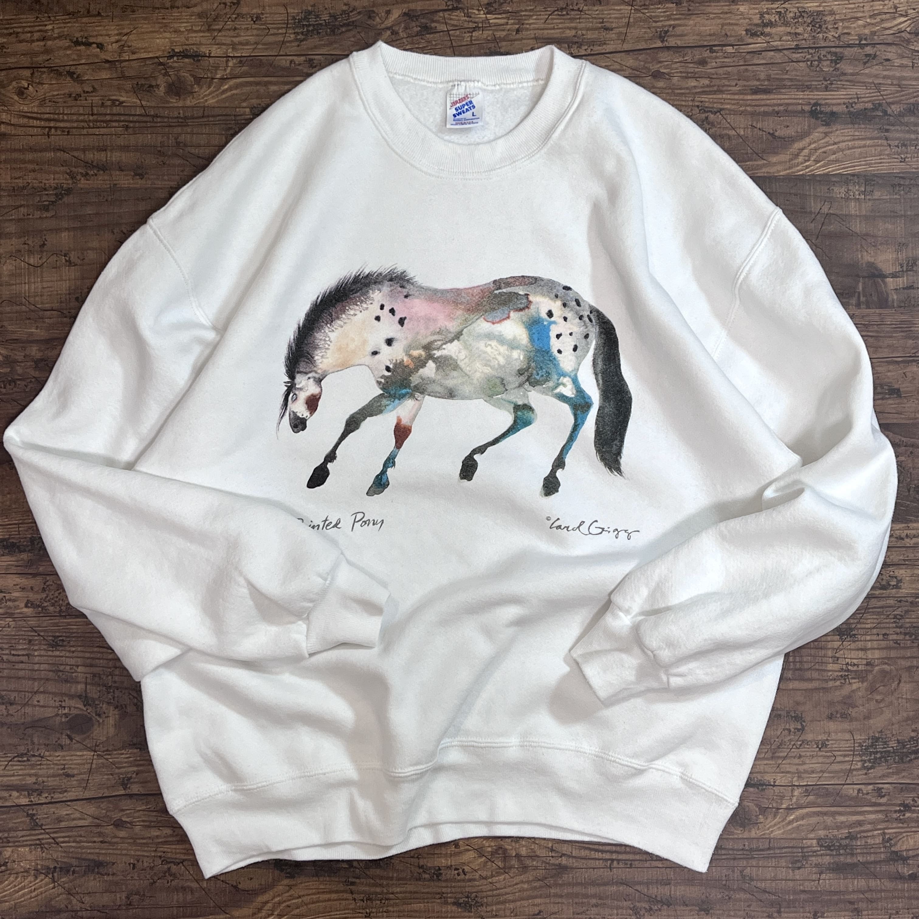 80s-90s USA製 L WHITE JERZEES SUPER SWEATS VINTAGE HEAVYWEIGHT PAINTED PONY ART PRINTED SWEAT SHIRT ©Carol Grigg DIVISION OF RUSSELL CORPORATION ポニー 馬 水彩画 アニマルプリント アートプリント ジャージーズ 肉厚 クルーネック スウェット トレーナー ホワイト 白 p25073279 | June