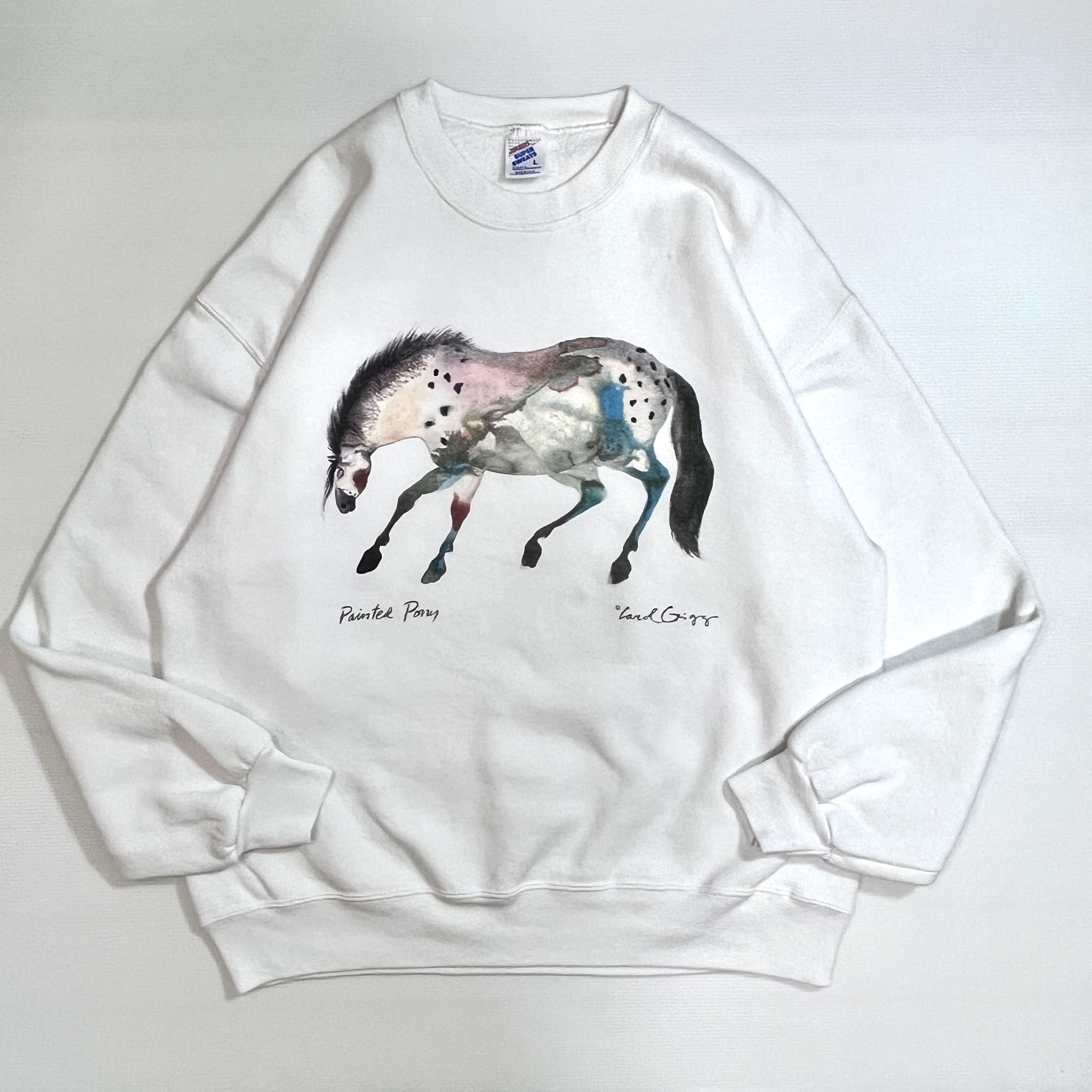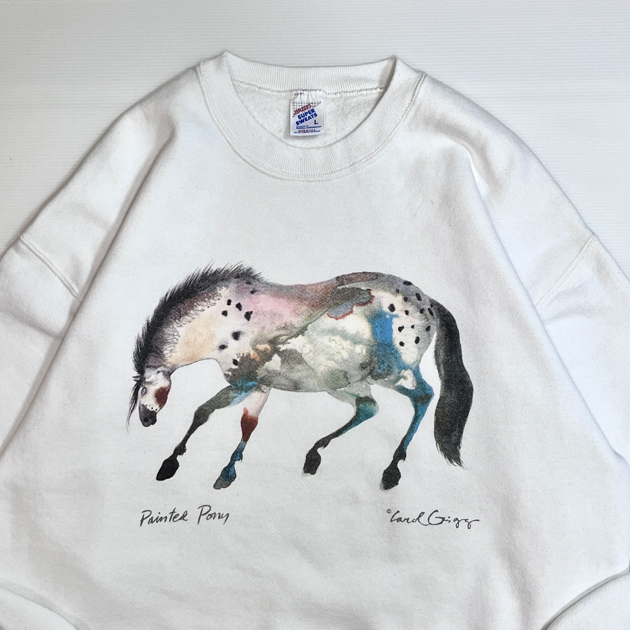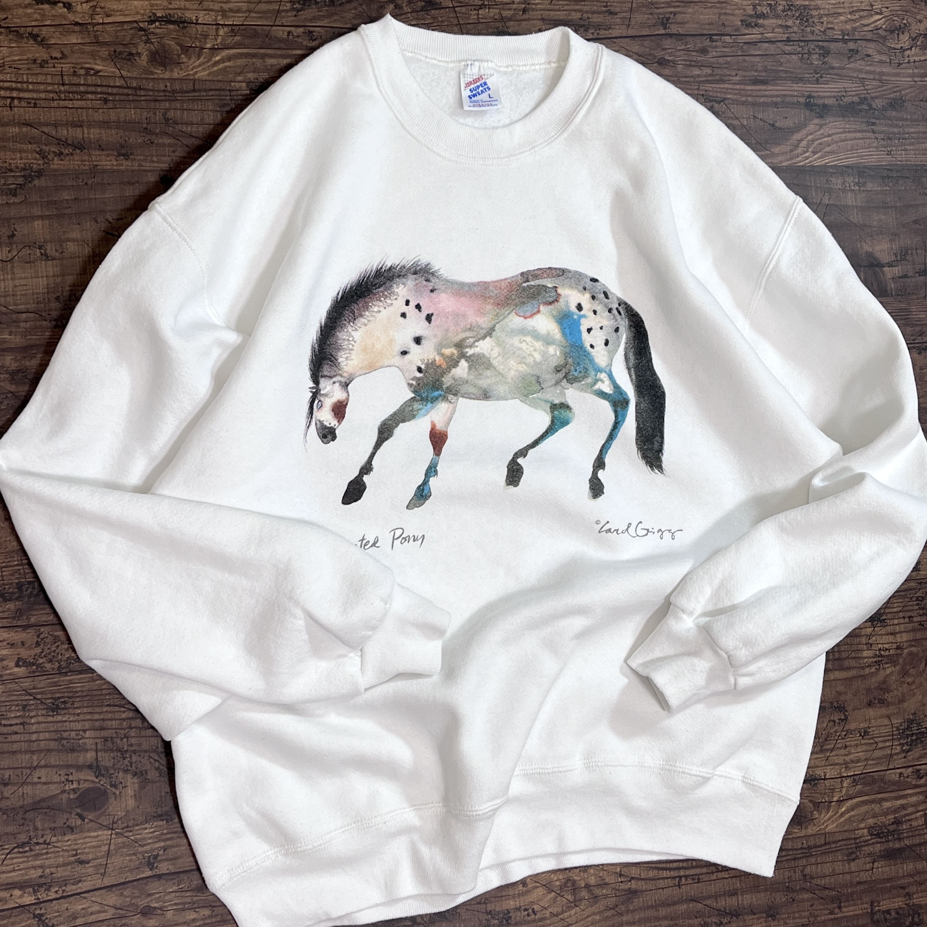 ・80s後半~90s前半のUSA製、ジャージーズボディ、Lサイズのゴールデンサイズ、同プリントのTよりもさらに珍しいスウェット、淡色のポニーがホワイトのボディに映える一枚