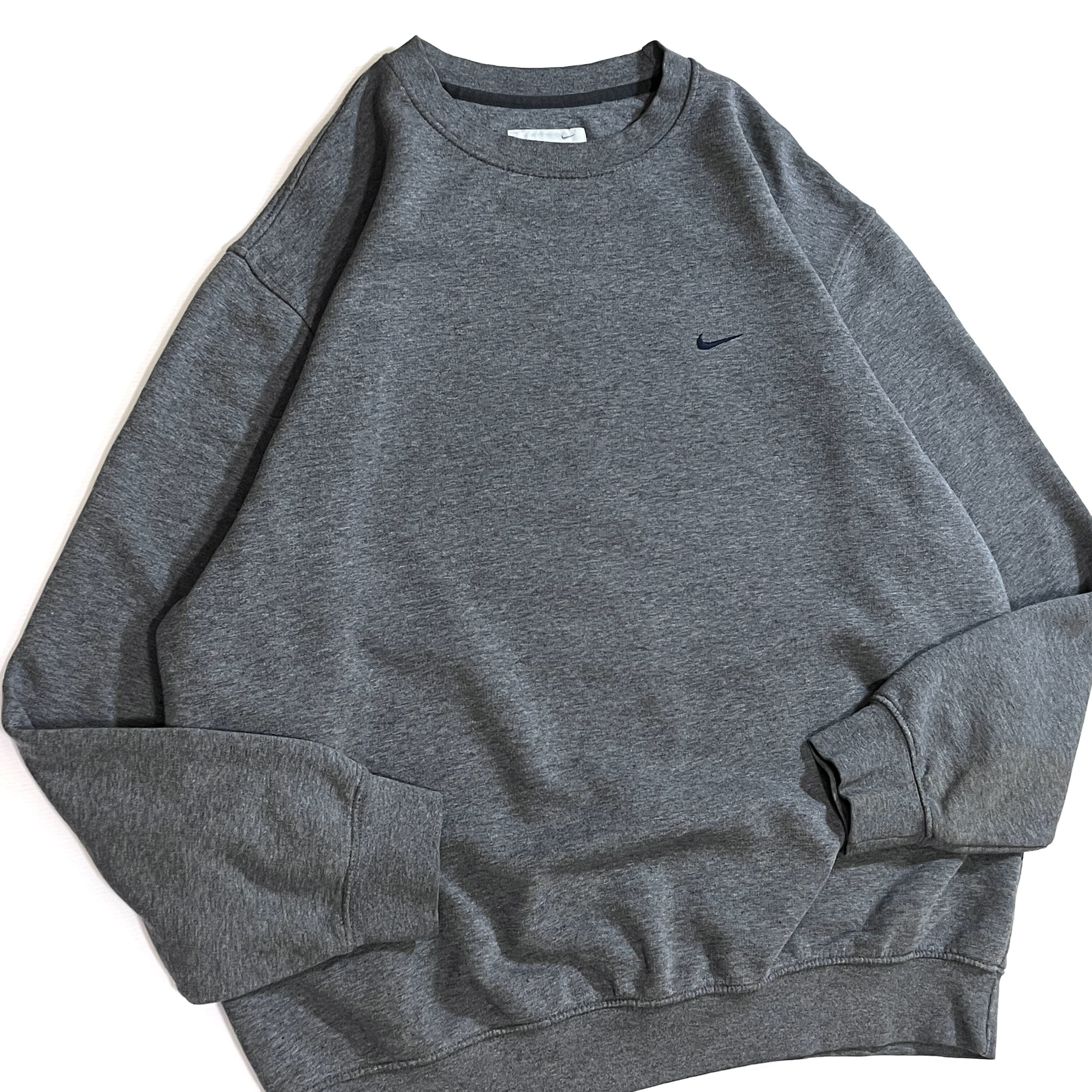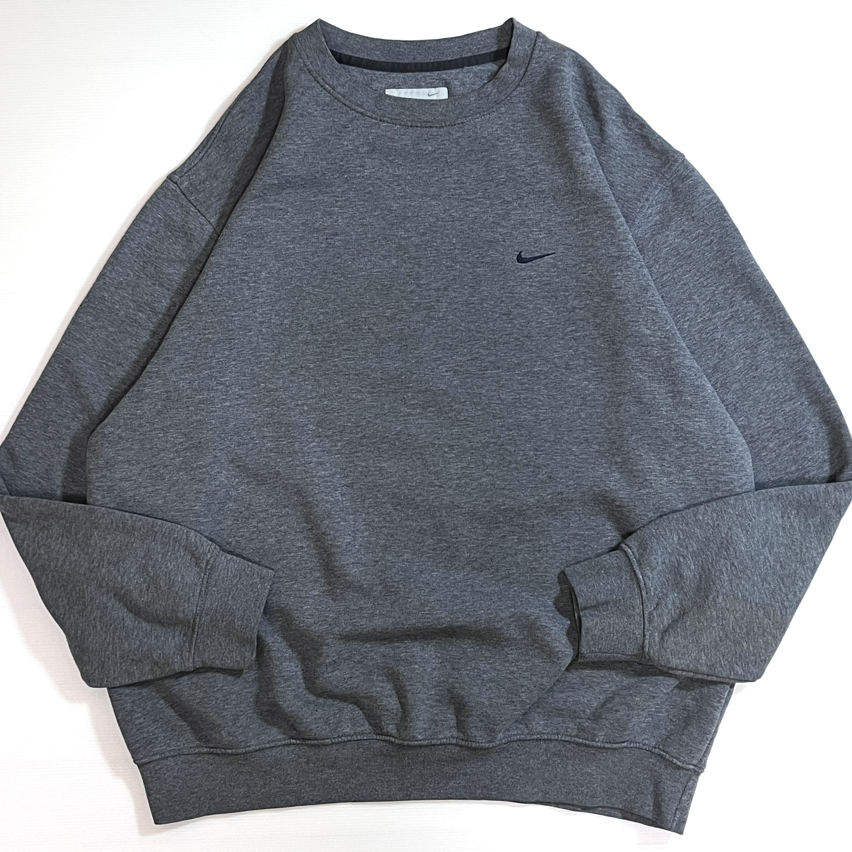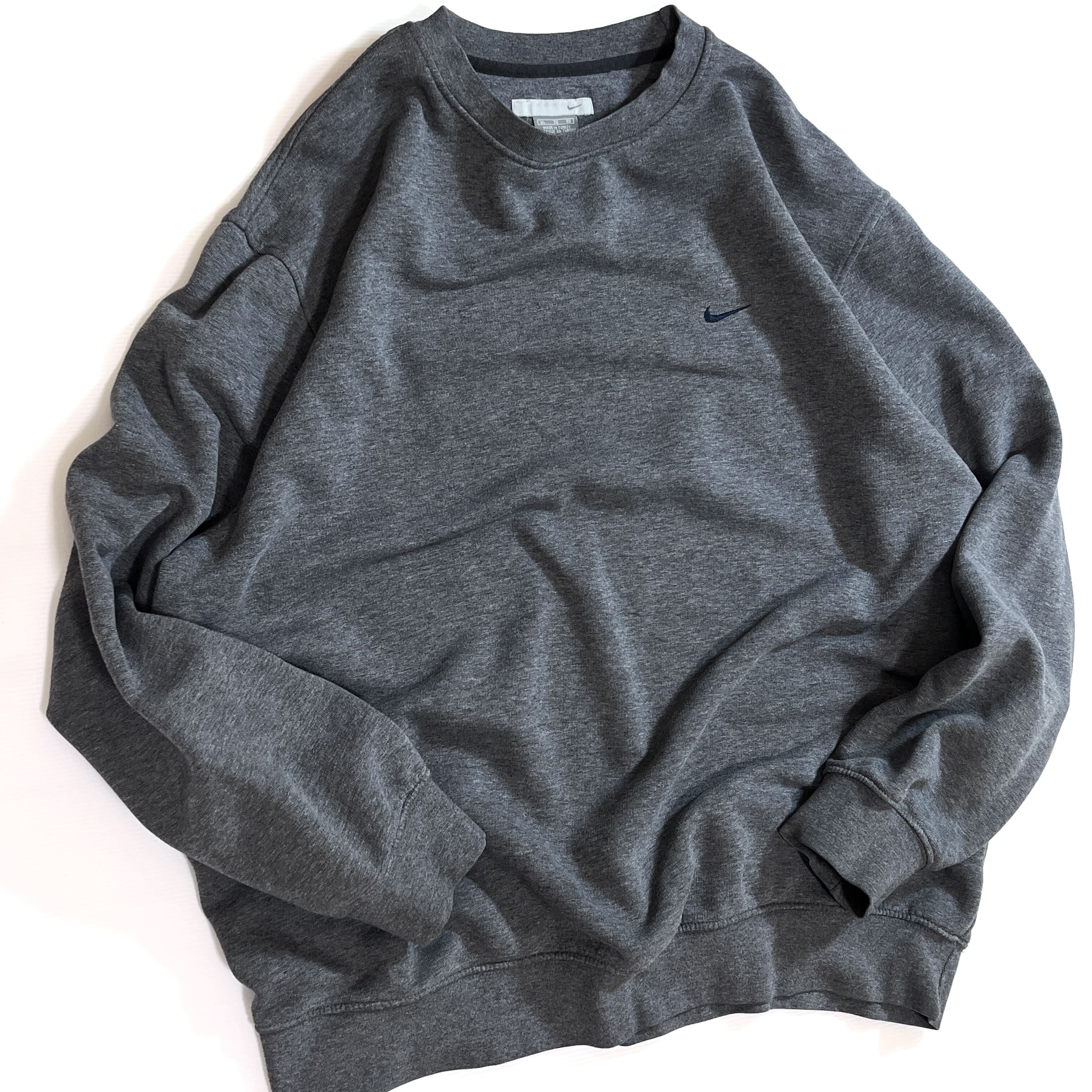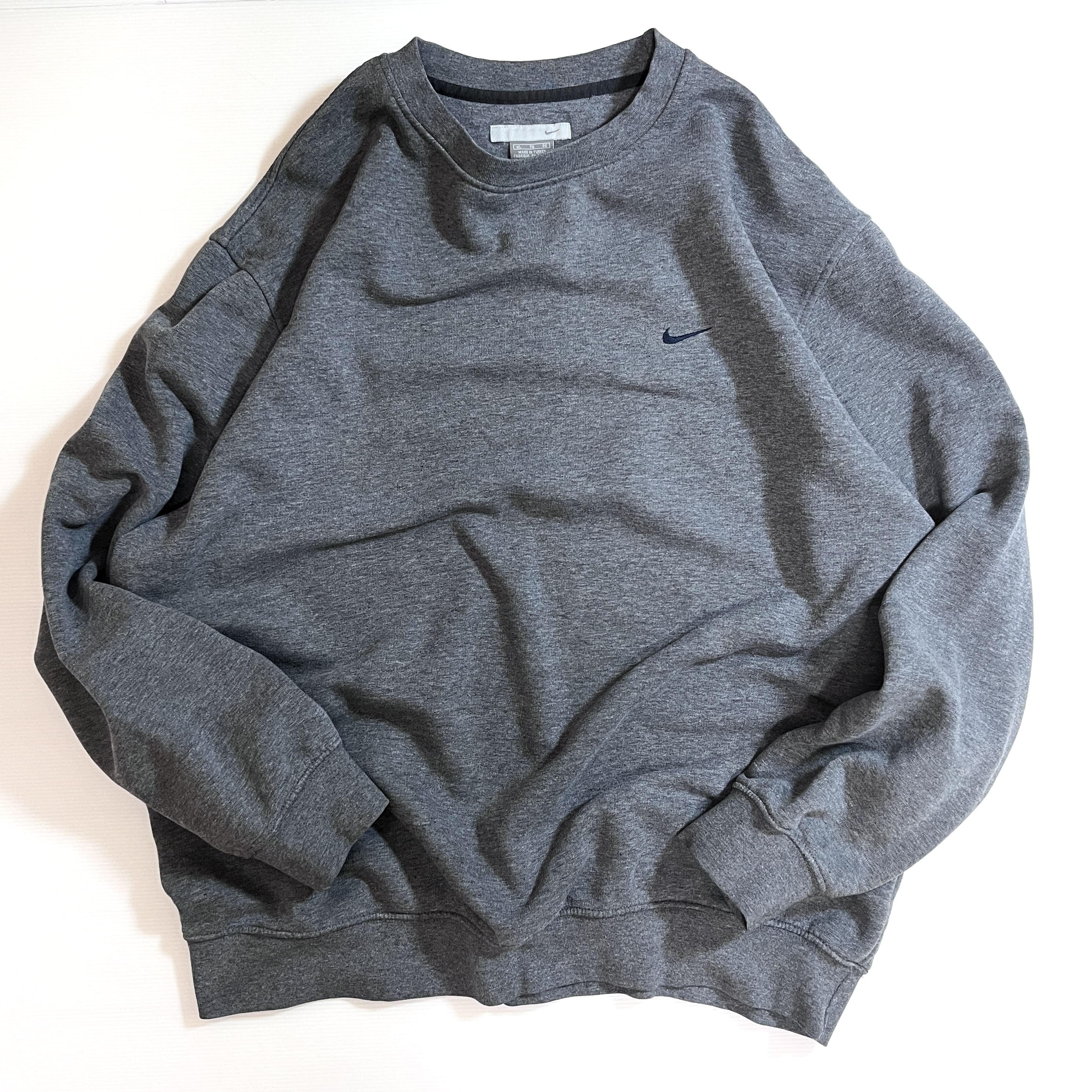 00s NIKE XL charcoal gray navy swoosh logo Fleece-lined crew neck sweat shirt ナイキ ワンポイント スウッシュ刺繍ロゴ 裏起毛 クルーネック スウェット メンズ トップス スウォッシュ刺繍 霜降りチャコールグレー トルコ製 p25073276 | June