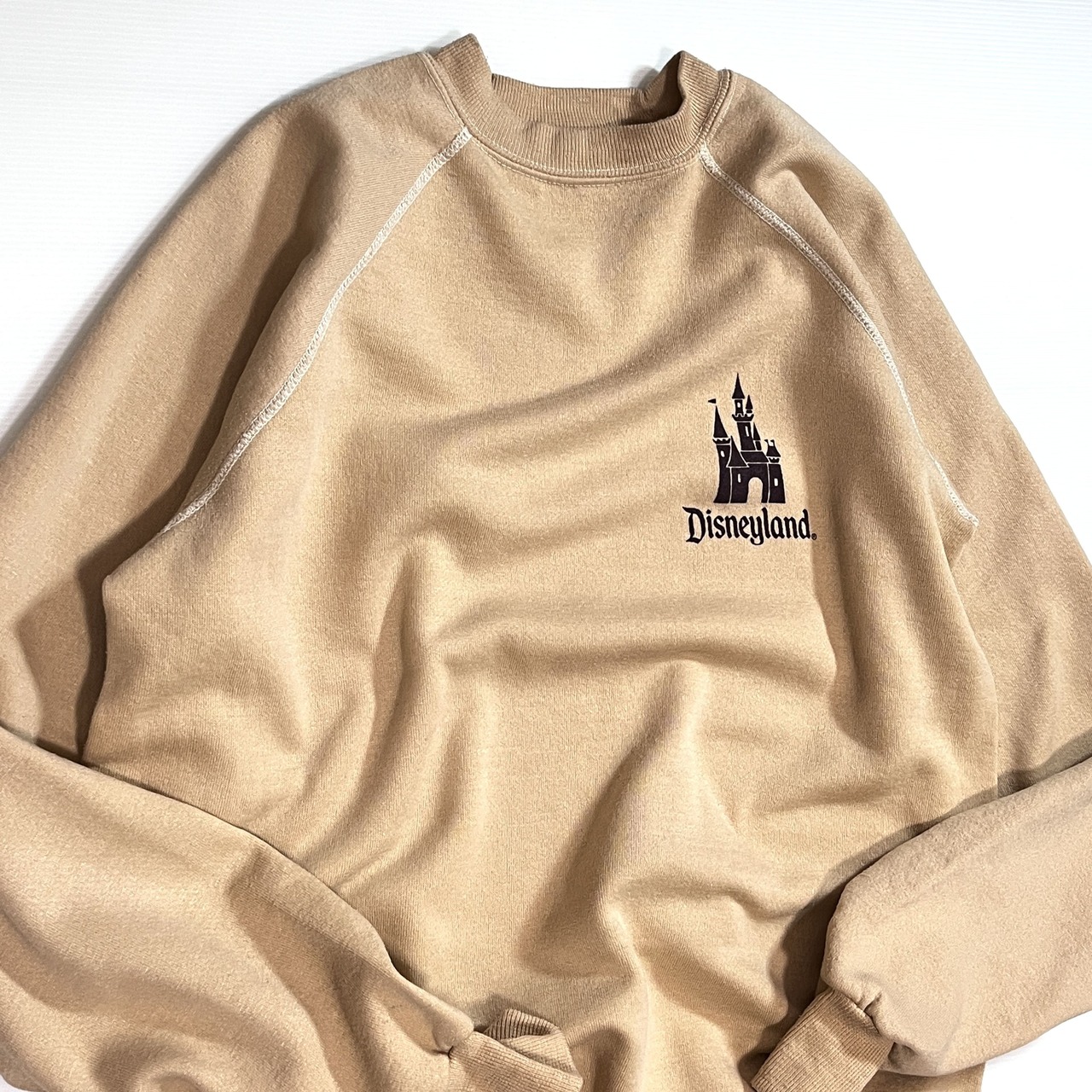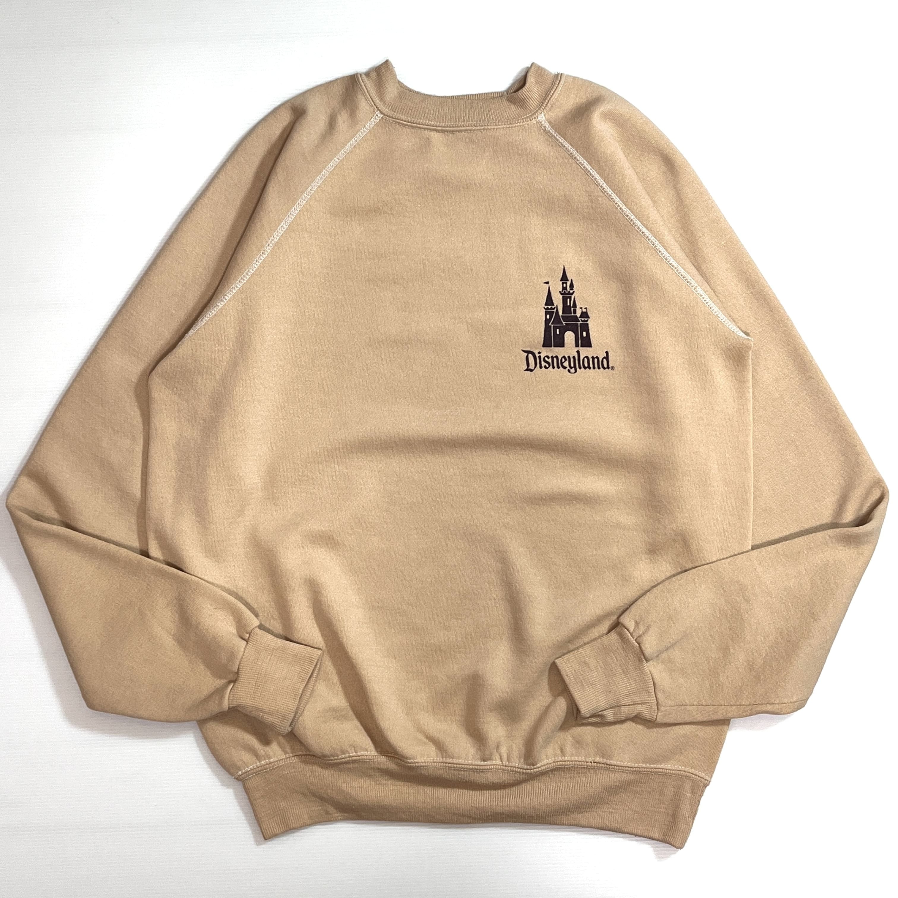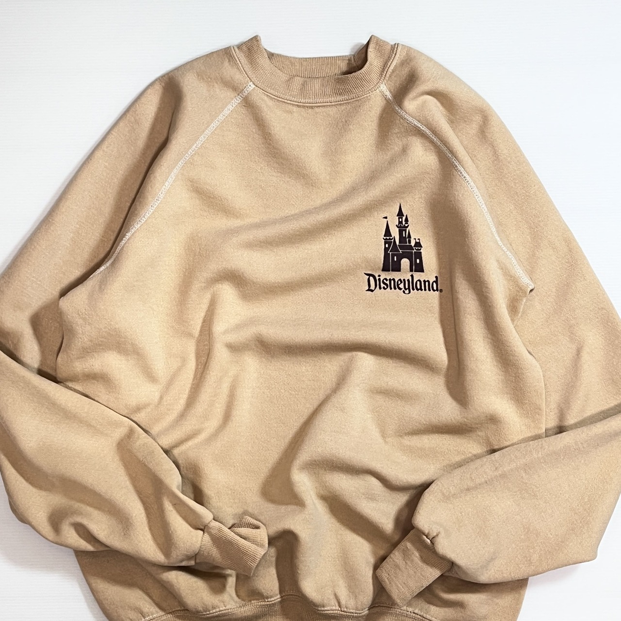 70s Disneyland ©Walt Disney Productions LARGE 42-44 Cinderella Castle print Old English logo print sweatshirt ウォルトディズニー ディズニーランド ヴィンテージ シンデレラ城 ワンポイント胸プリント オールドイングリッシュロゴプリント 裏起毛 ラグランスリーブ クルーネック スウェット ベージュ ブラウン トレーナー ビンテージ p25043177 | June