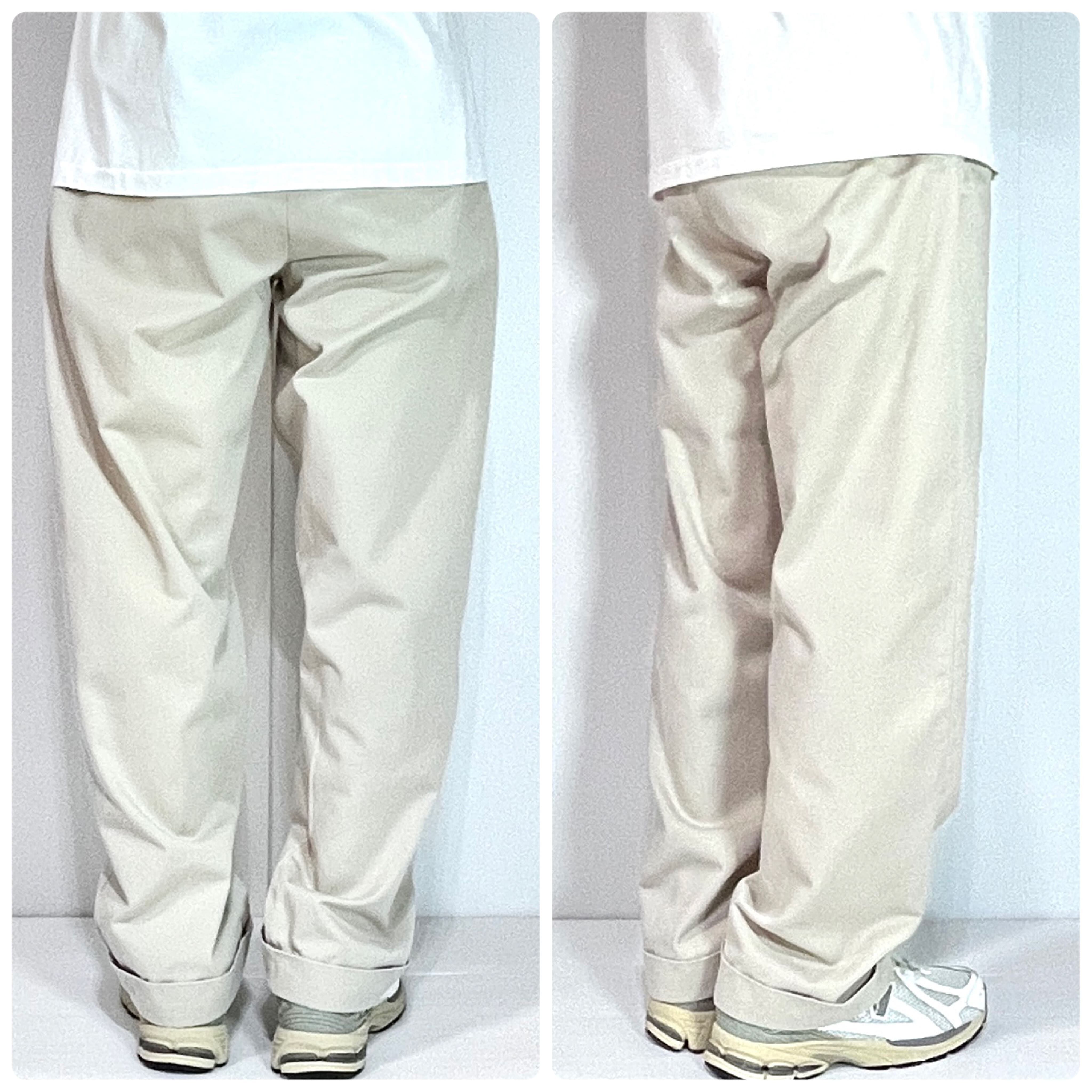 ・厚手のしっかりとしたコットンツイル素材、腰回りやワタリ幅はゆったりとしたワイドテーパードのストレートシルエット