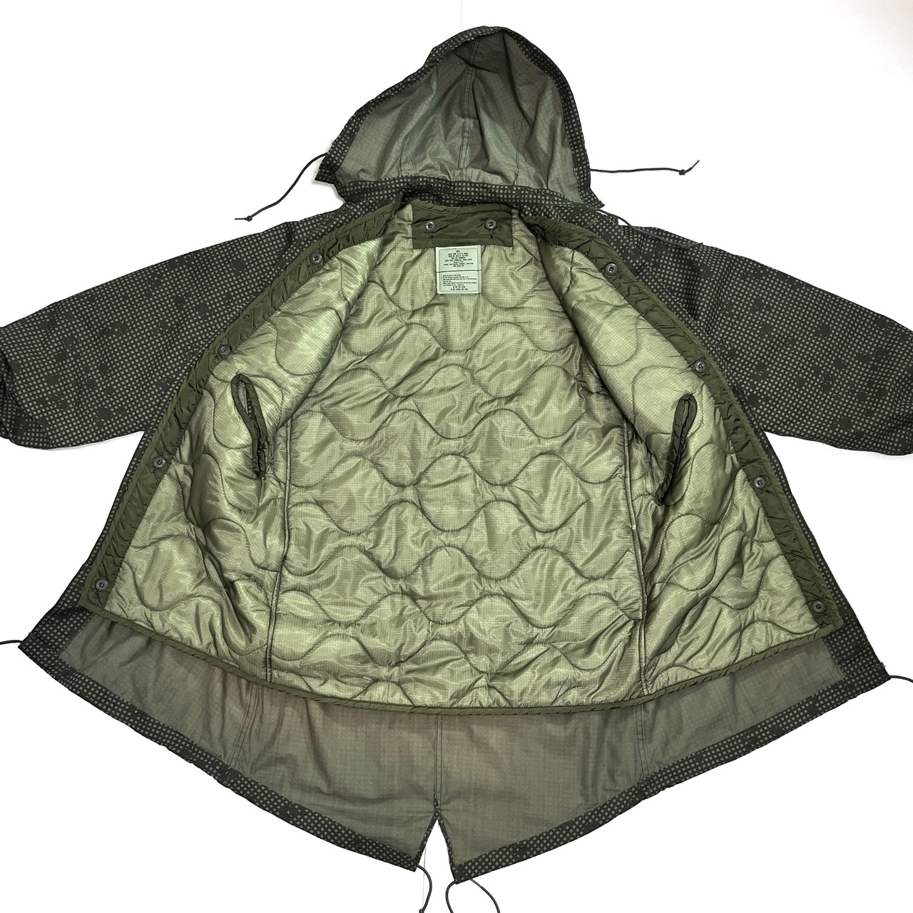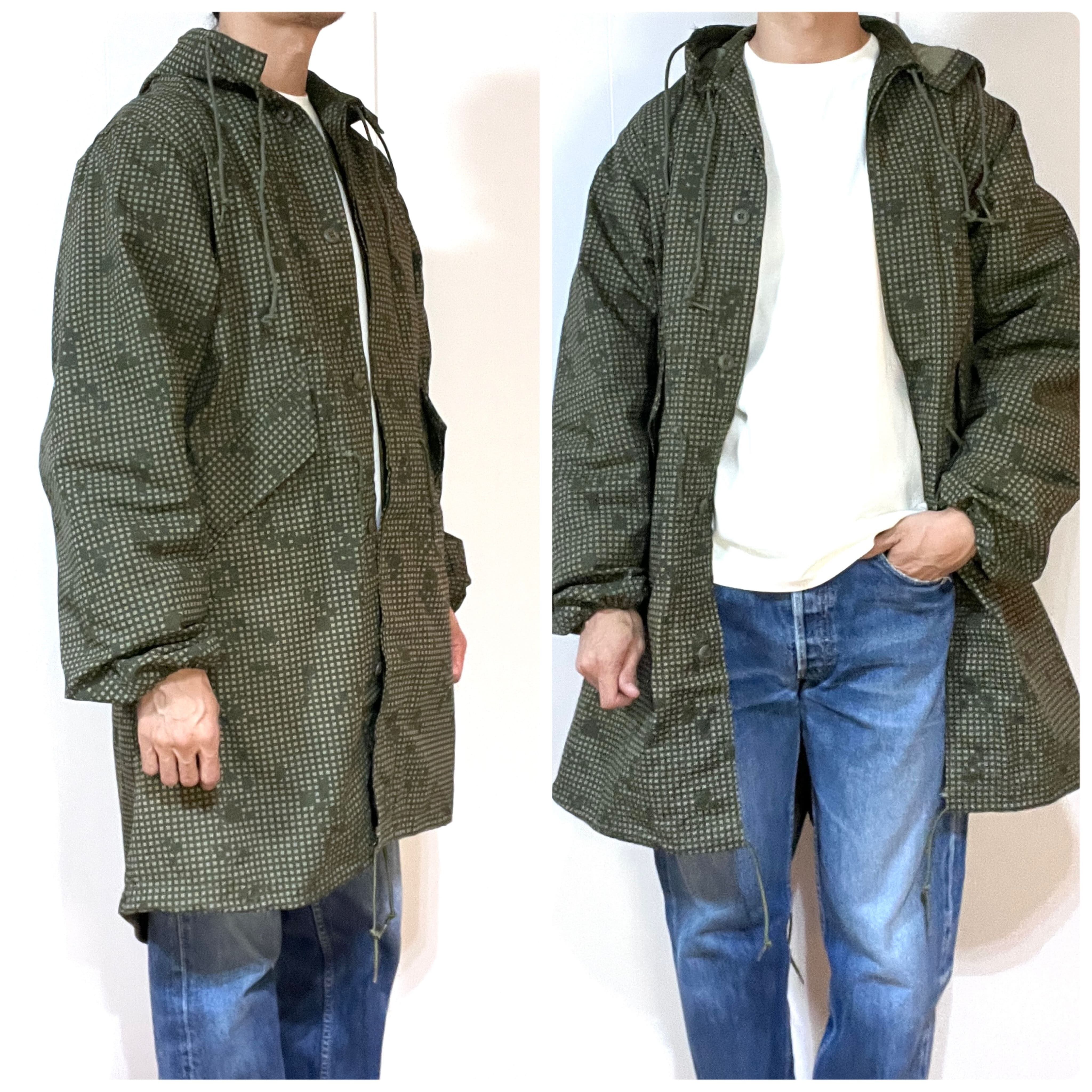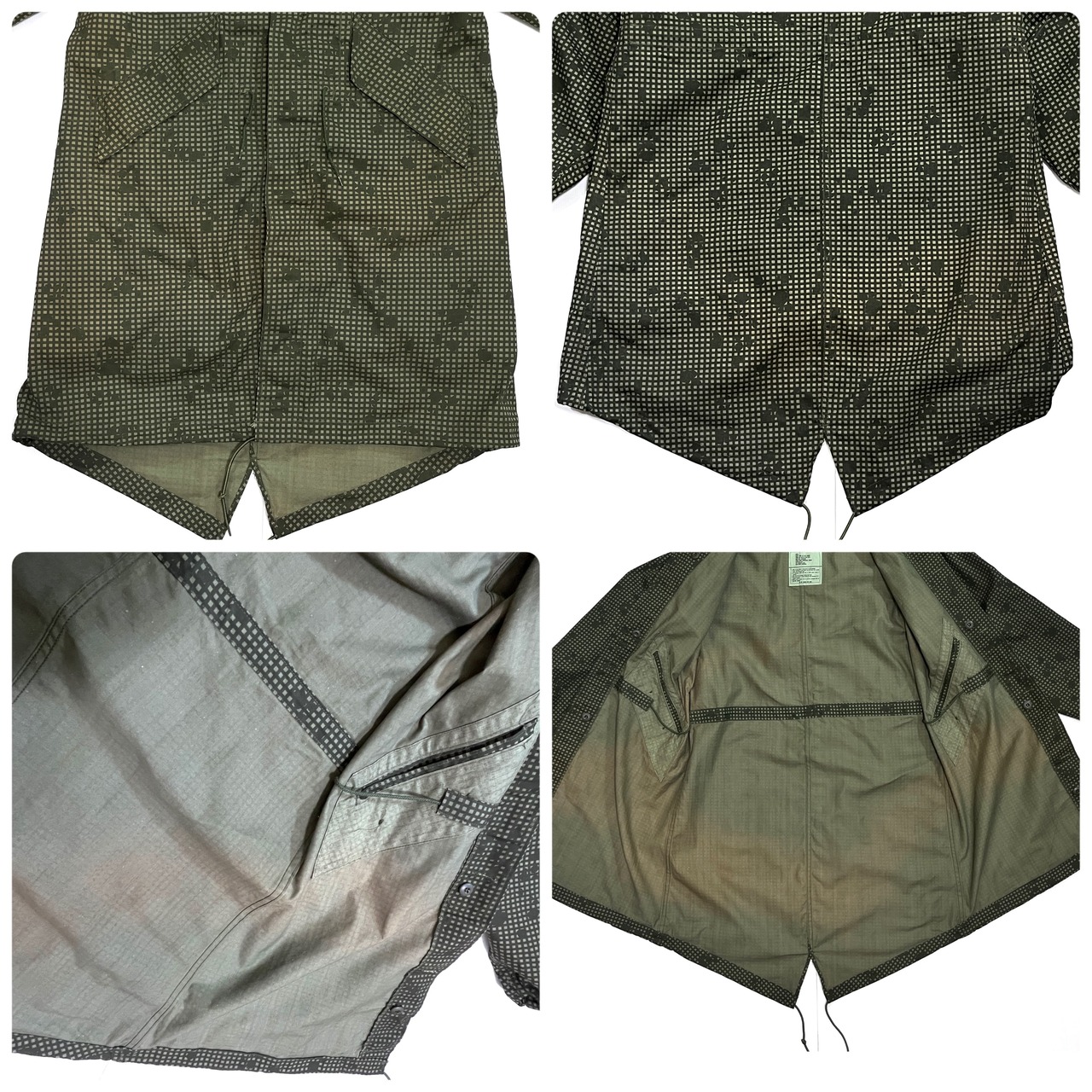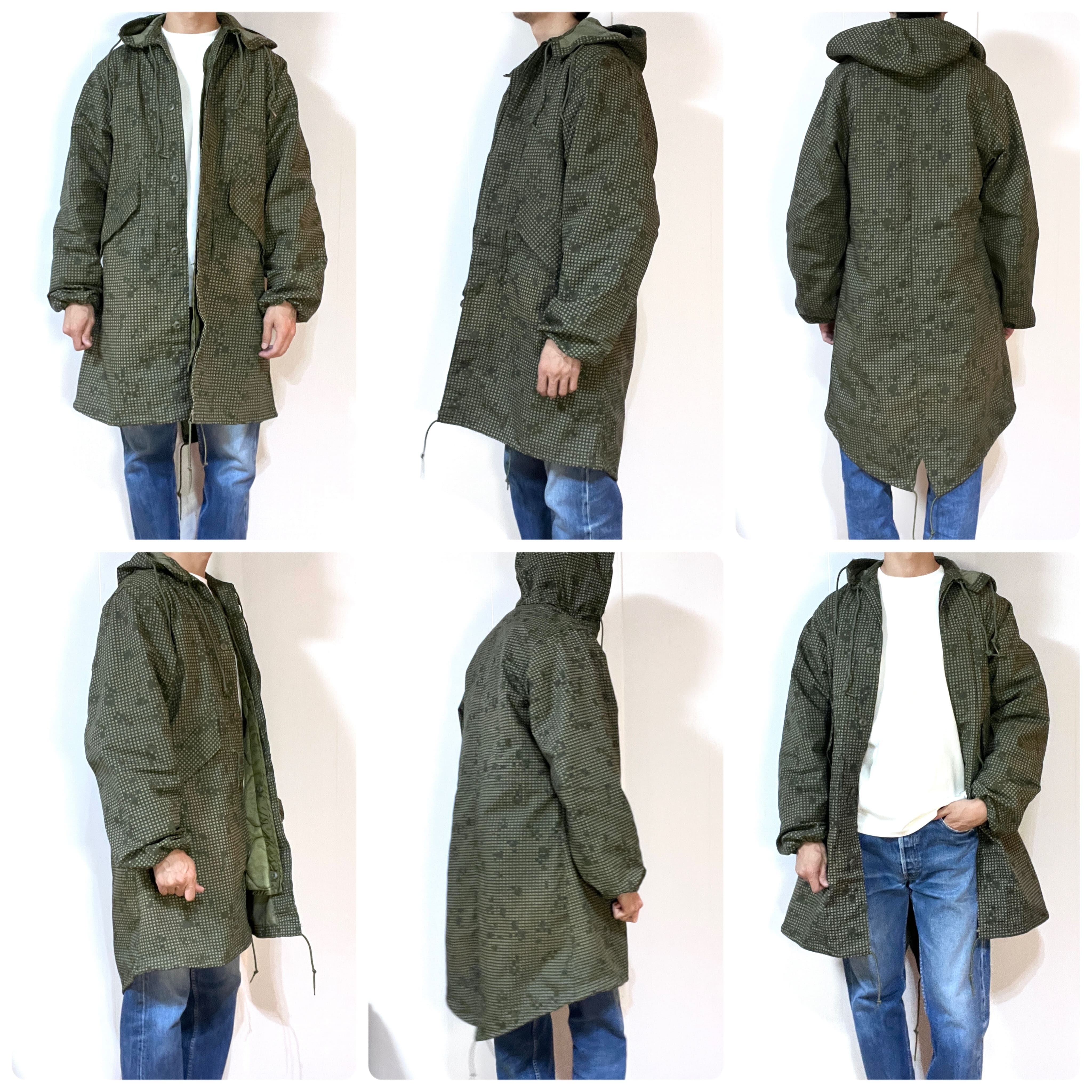 ・後ろの裾が長めのM-51やM-65モッズコートと同様のフィッシュテールのディテール、フロントは比翼ボタンの仕様、ライニングはボタンで着脱可能、オーバーコート仕様による貫通ポケット、シェルとライニングは年代も製造メーカーも同一の完品