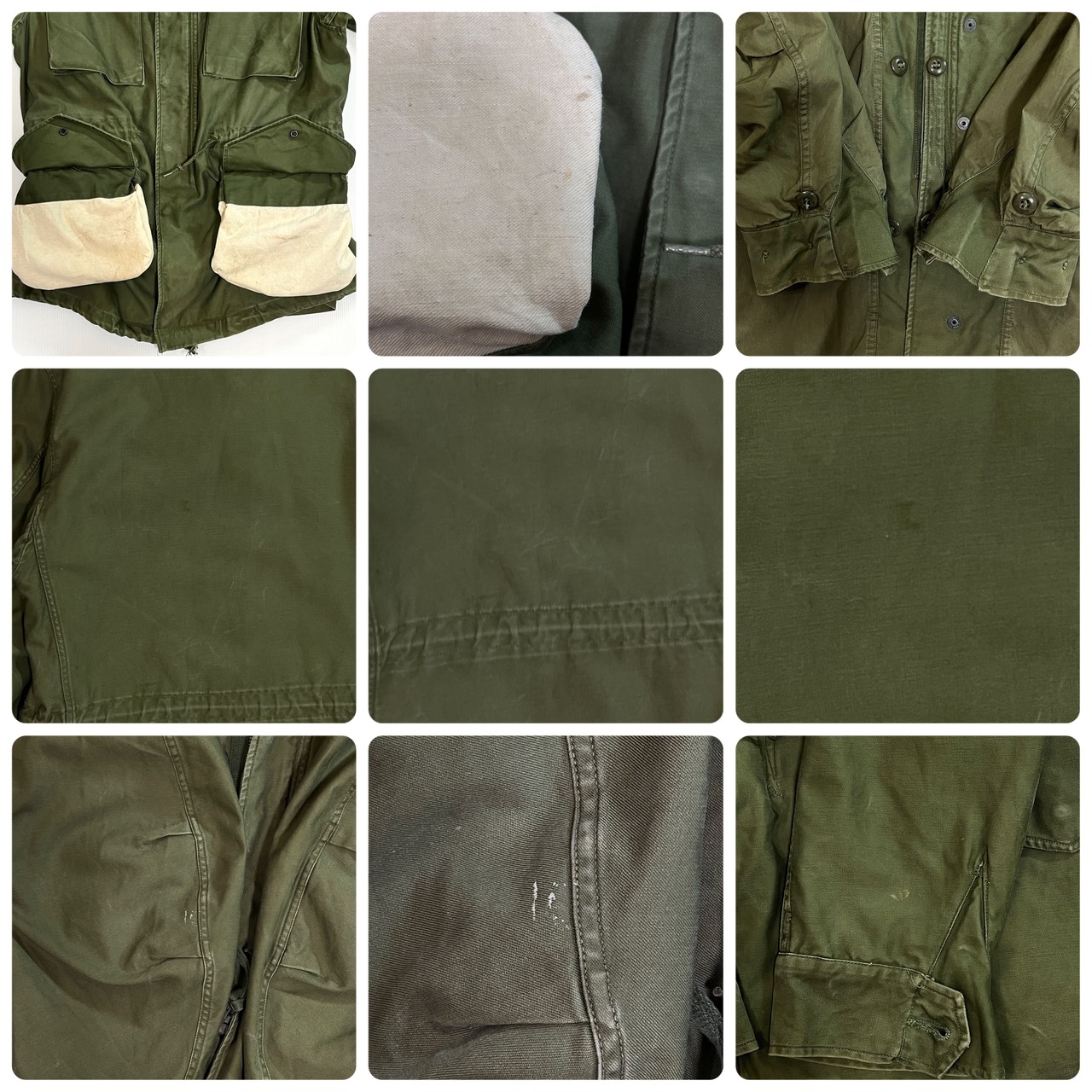 ・ポケット内部はM65フィールドジャケットのような生成りのコットン生地、袖口はマチ付きのボタンで開閉、ジャングルファーティーグ初期型タイプと同様の碁石型のツヤのあるボタン、ほどよくフェードしたオリーブグリーンの色味にシルバーのアルミジップが雰囲気抜群