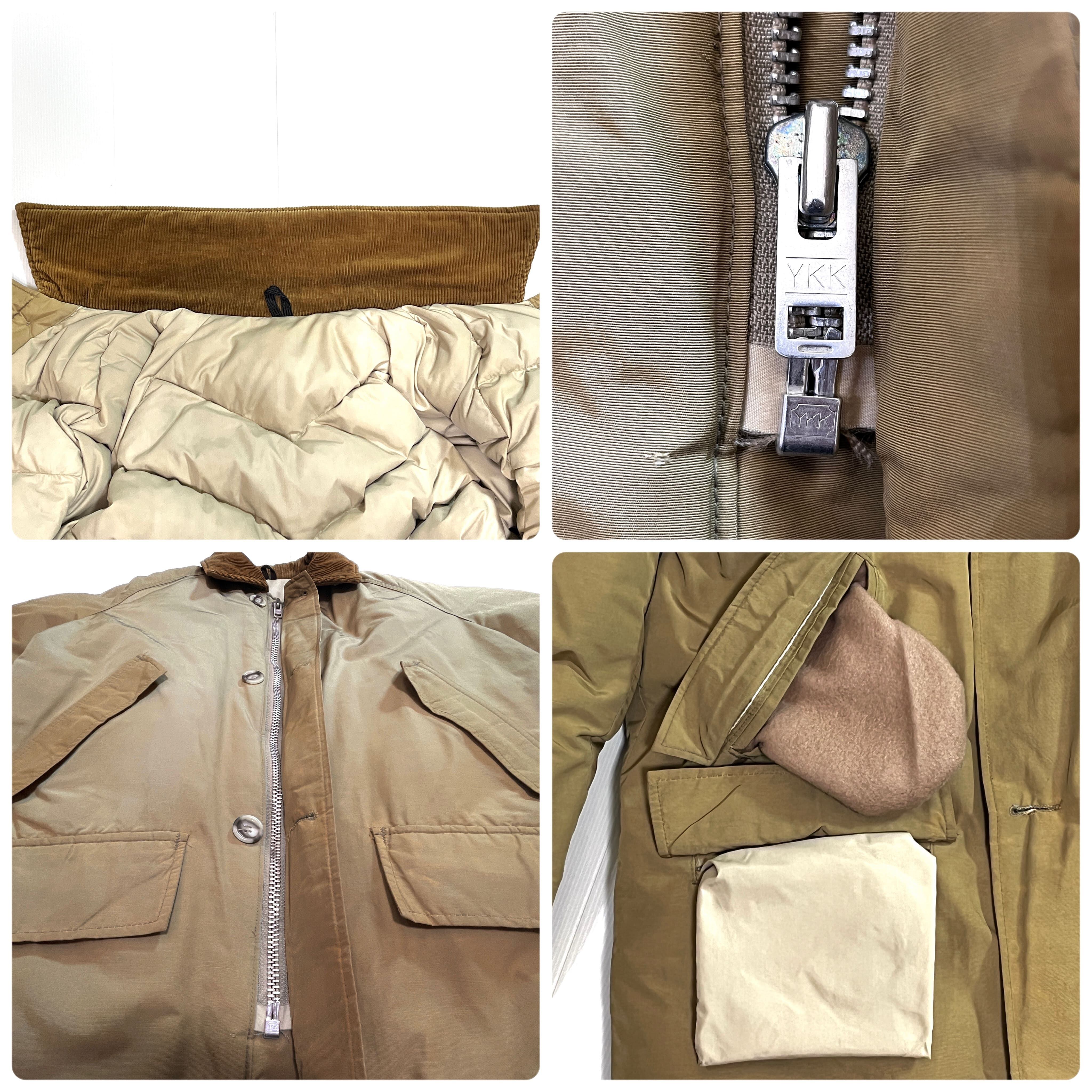 ・光沢のあるコットンナイロンの64クロス、ブラウンの太畝コーデュロイの襟、フロントはボタンとYKKのデカアルミジップでミリタリーのN-3Bのようなディテール、表にフラップ4ポケット・内ポケットが1つ、上ポケットは柔らかく温かいフランネル素材のハンドウォーマーポケット、シルエット調節可能なストッパー付きのウエストのドローコード、襟裏には当時別売りだったフードを取り付けるためのスナップボタン