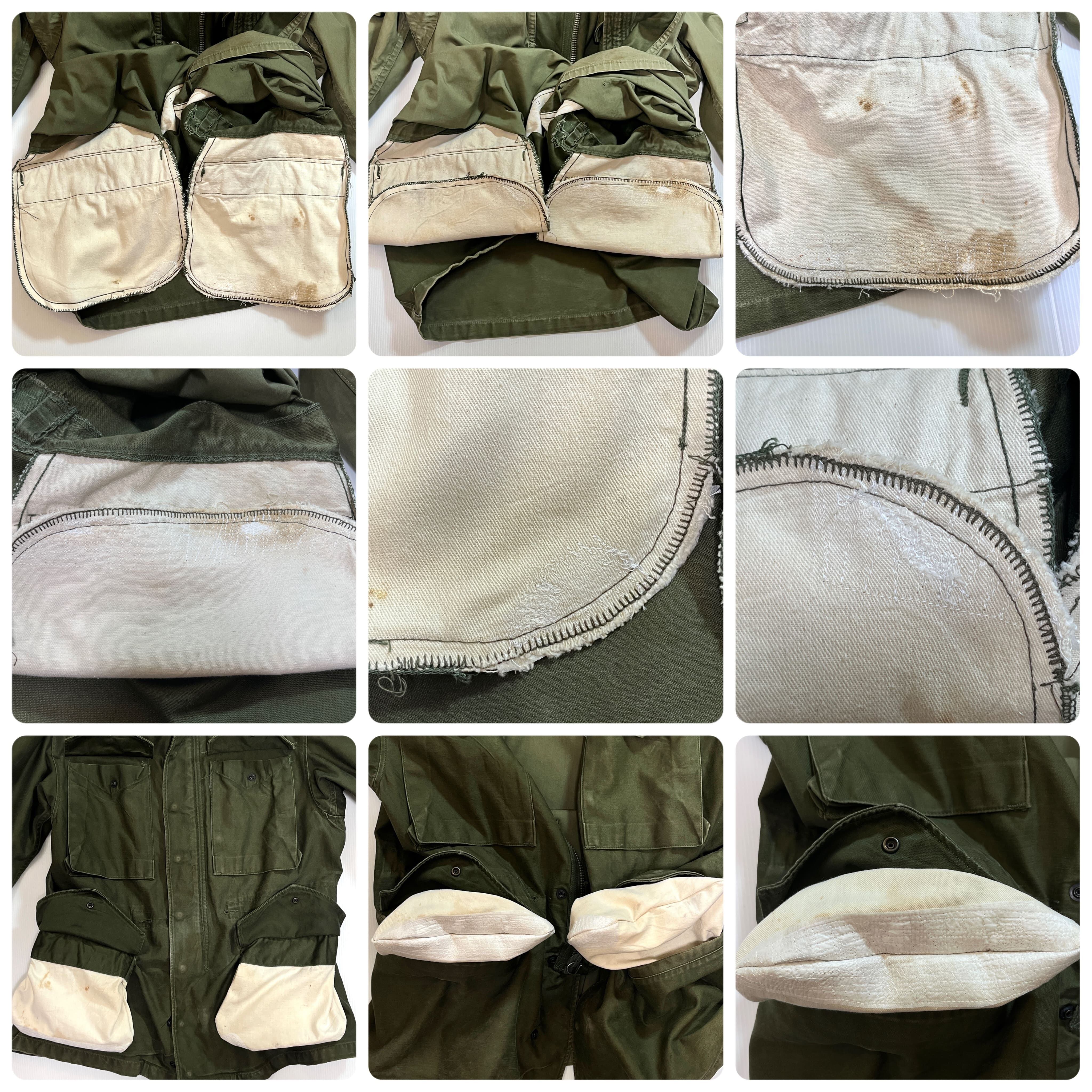 ・ポケット内部はM65フィールドジャケットのような生成りのコットン生地、袖口はマチ付きのボタンで開閉、ジャングルファーティーグ初期型タイプと同様の碁石型のツヤのあるボタン、襟はスタンドになるフラップチンストボタン付き、オリーブグリーンに経年変化による艶消しのアルミジップが雰囲気抜群、S/Sのレアサイズ