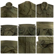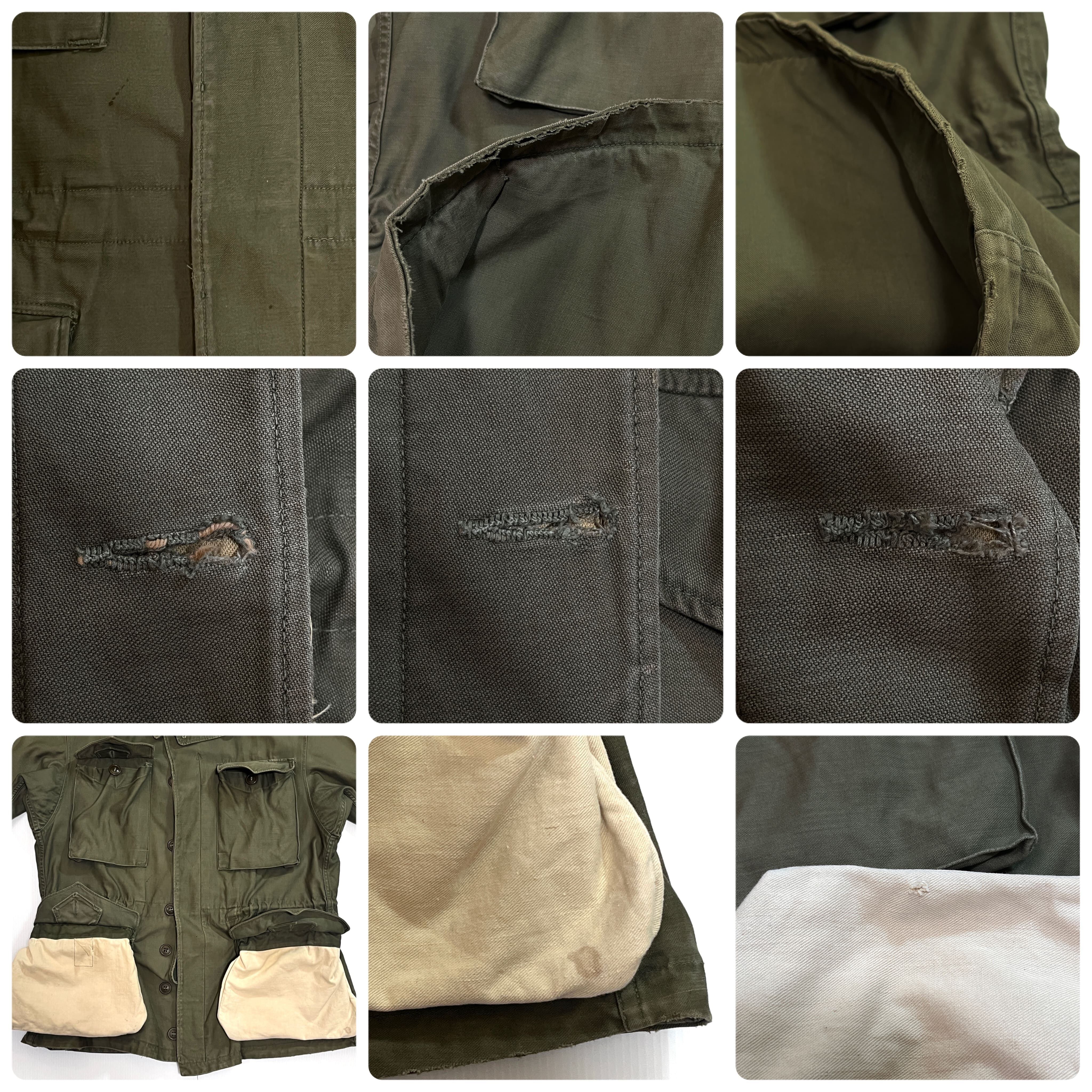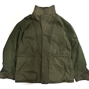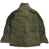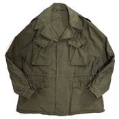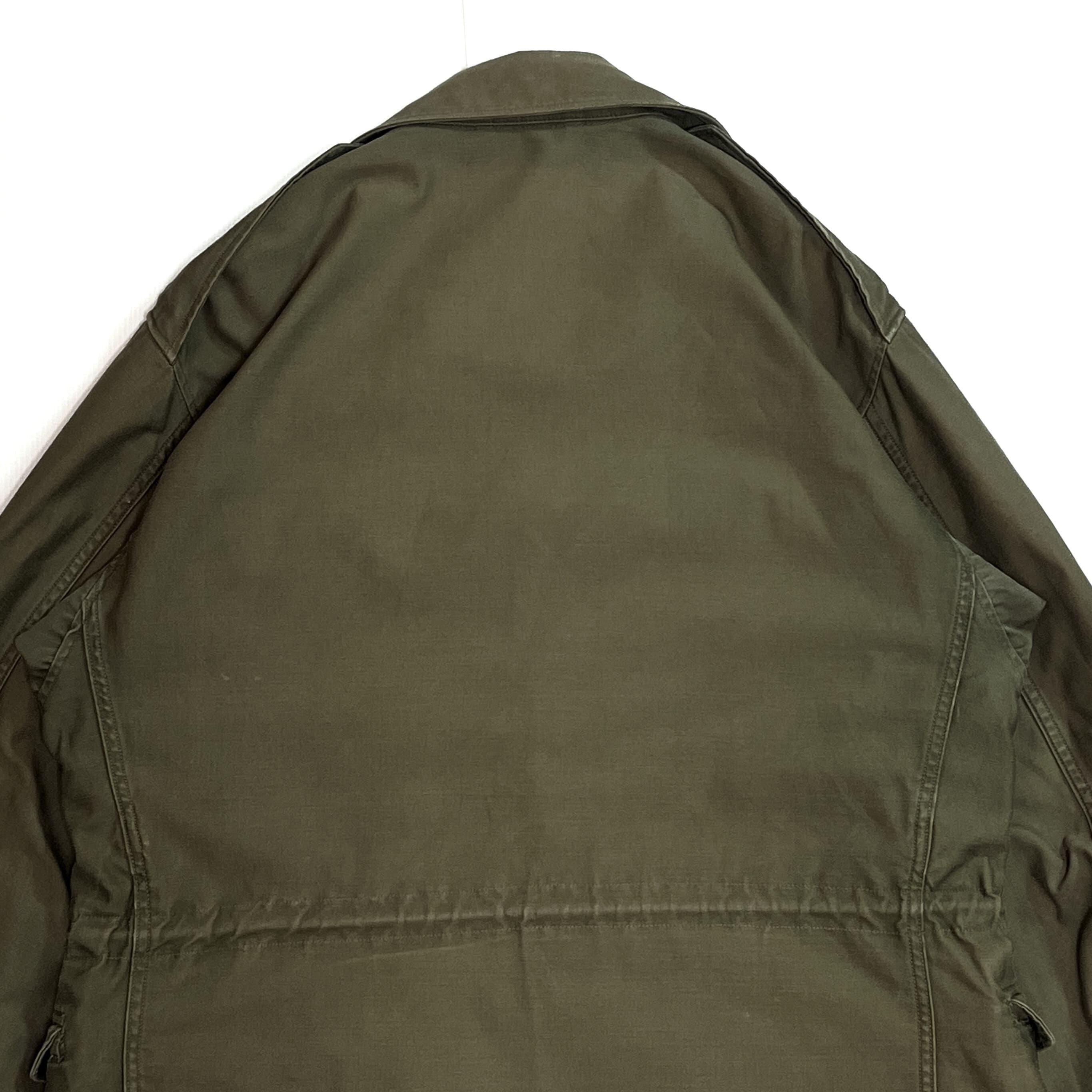 ・36Rの希少サイズ、オリーブドラブのフェードした雰囲気抜群の色味、薄っすらとステンシル入りの裏地付きの厚手のコットンサテン素材、チンスト付きのオープンカラー、マチ付きの袖、比翼ボタンの前立て、4つのフラップポケット、ウエストのドローコード、ポケットのスレキはキナリの厚手のコットンキャンバス素材