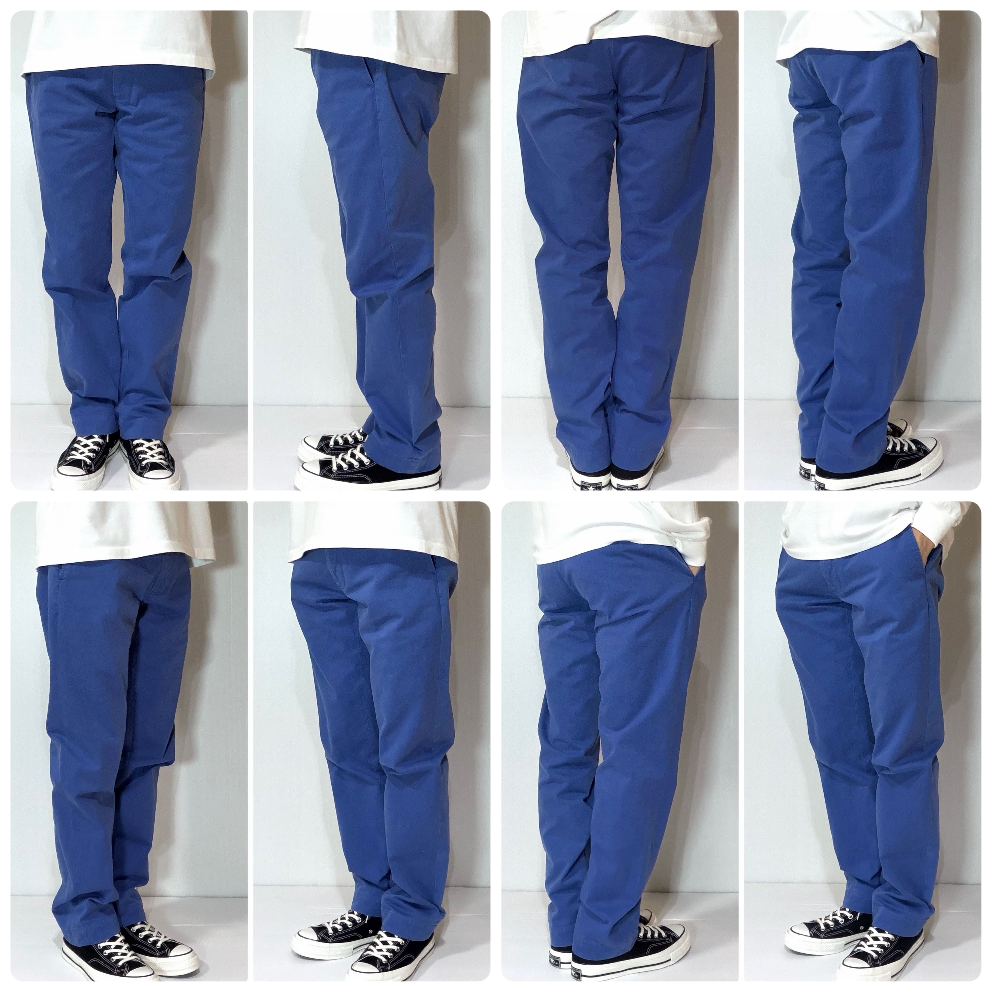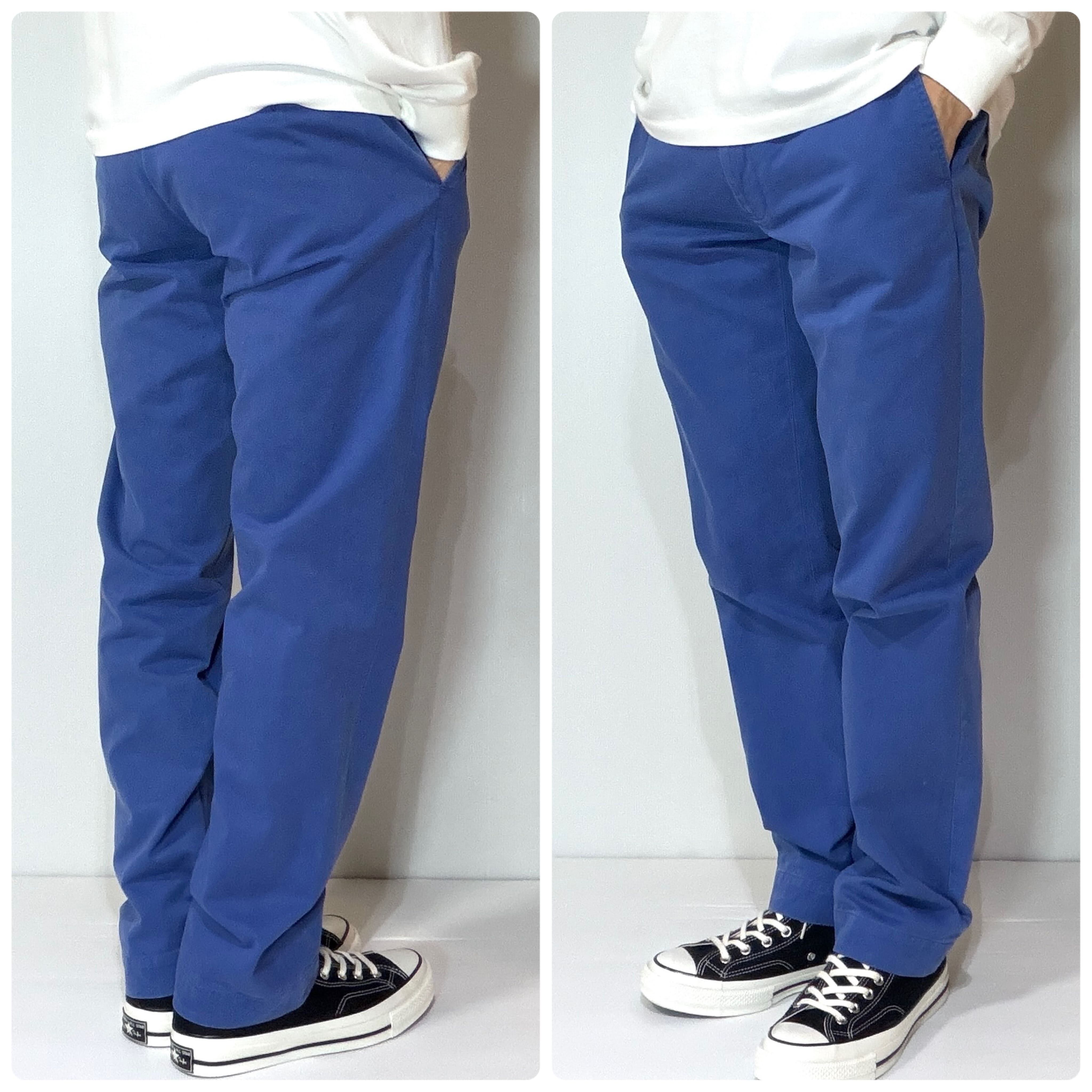 ・肌触りのいい厚手のコットンツイル素材、股上はやや浅めで裾にかけてテーパードの掛かったスリムフィットのストレートシルエット