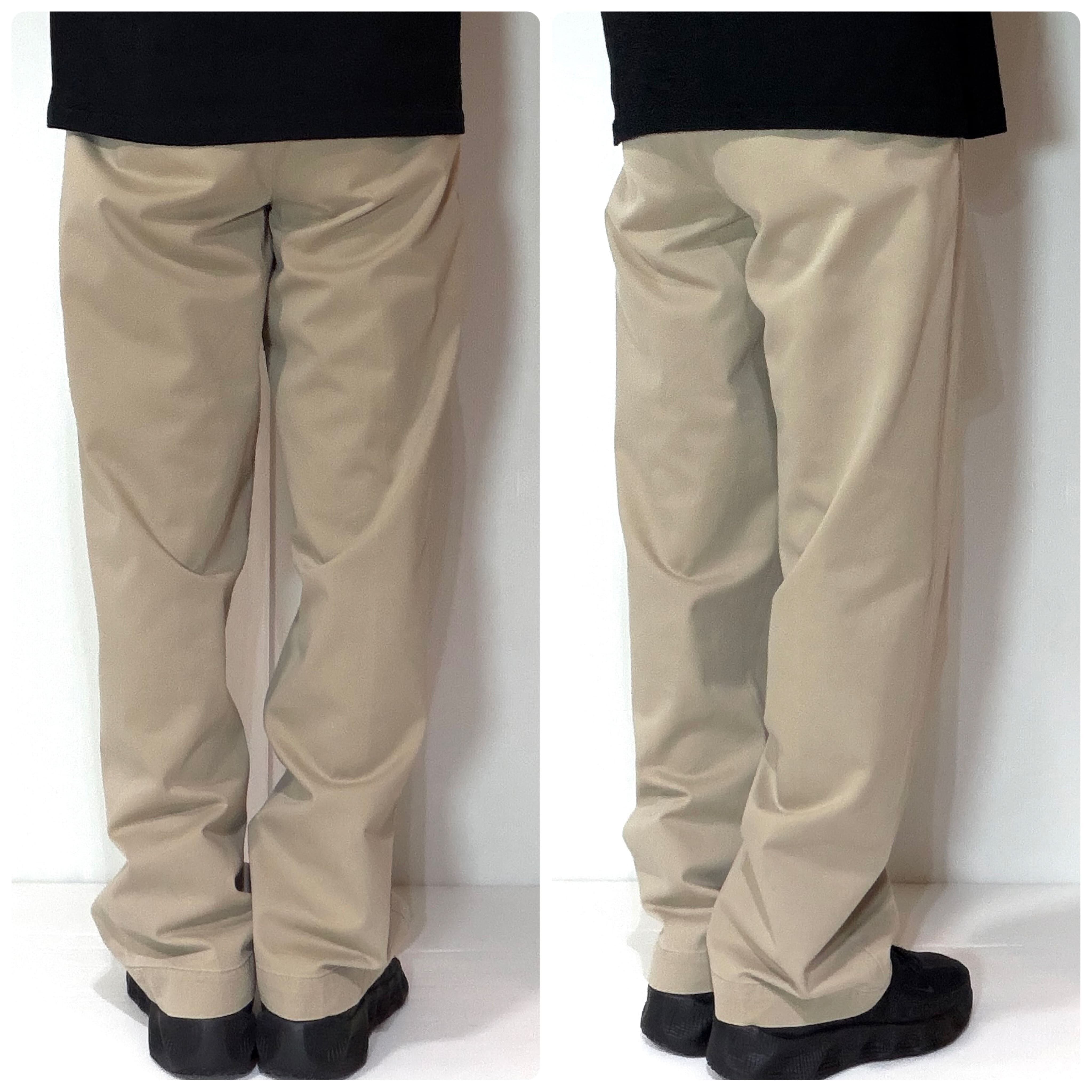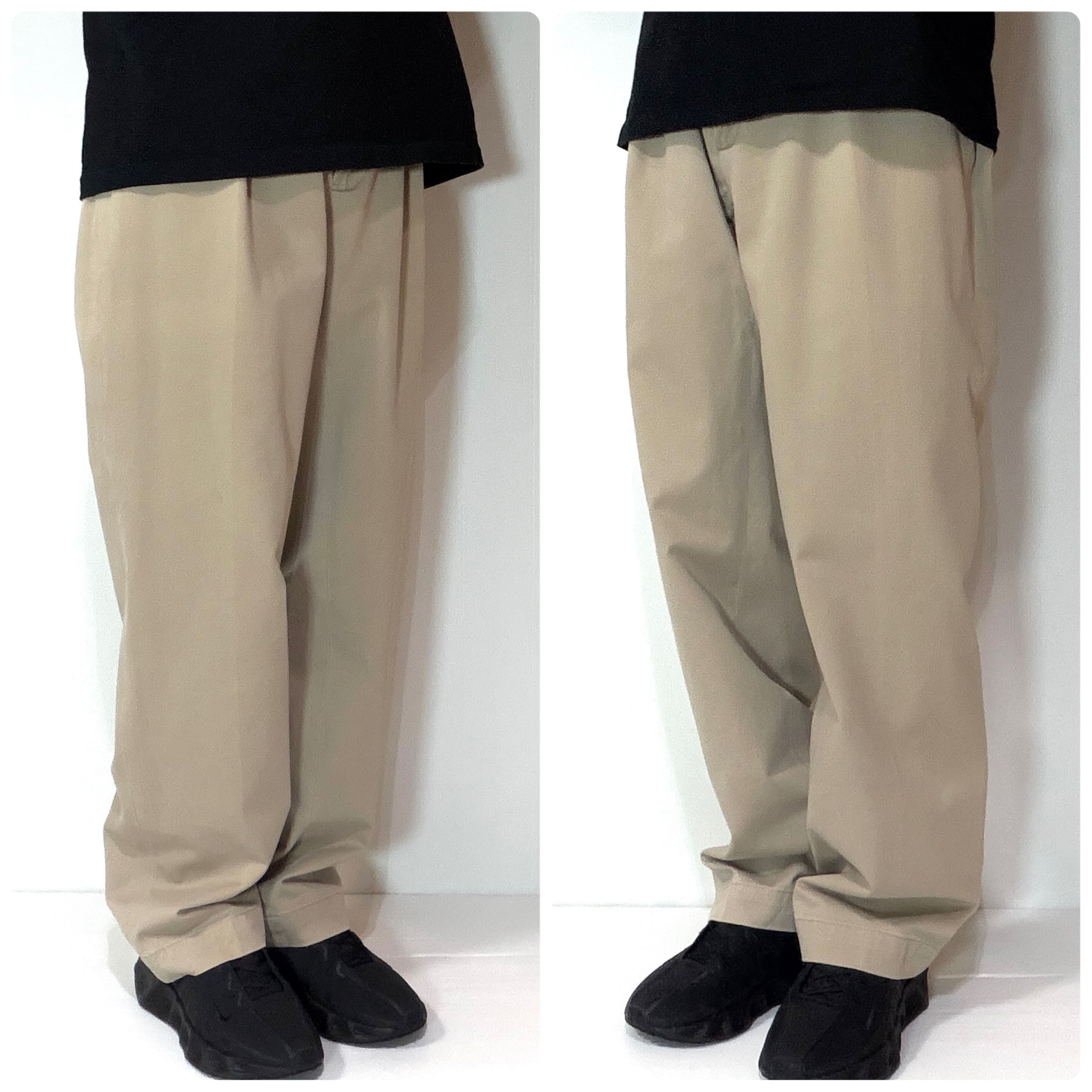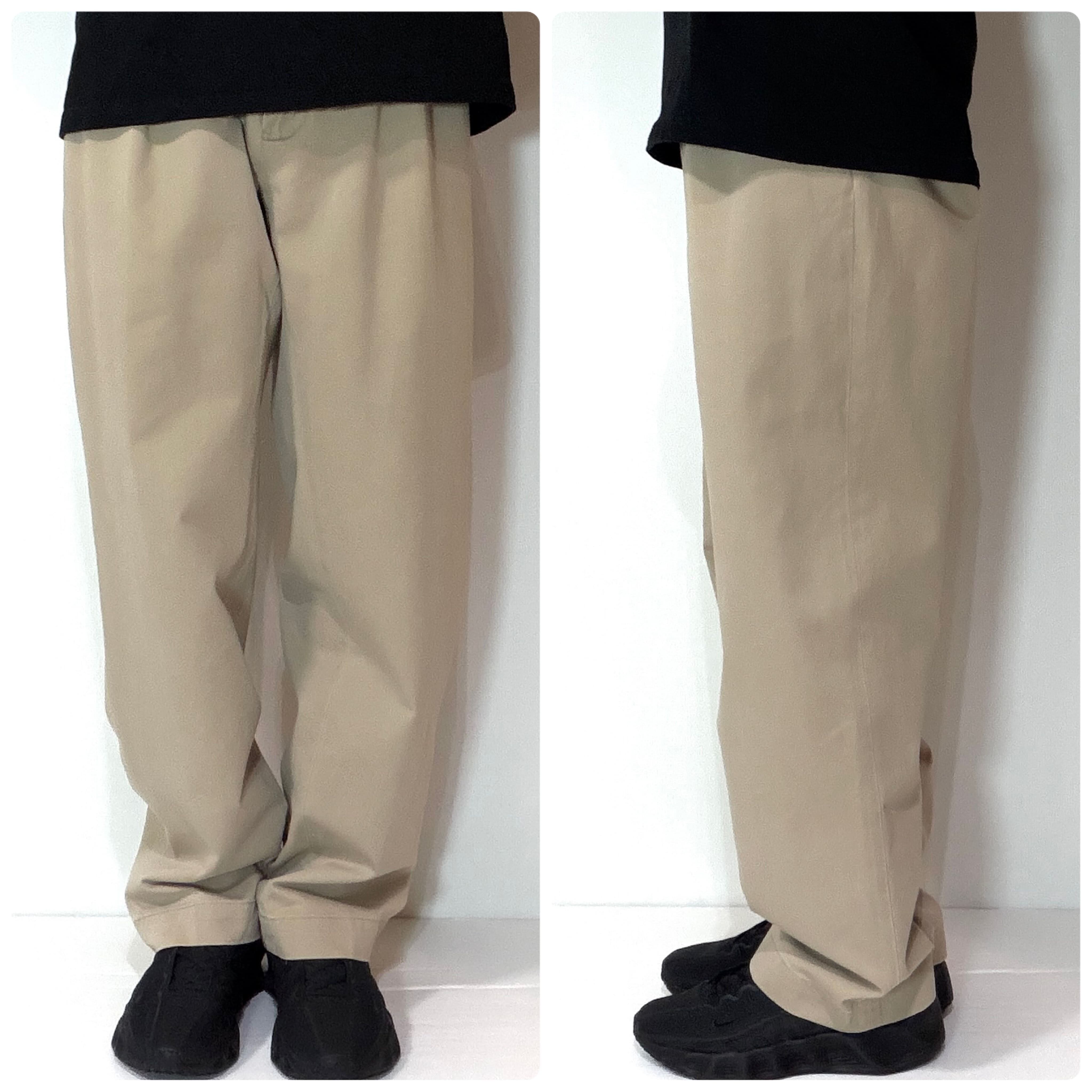・柔らかい肌触りのしっかりとした厚みのチノクロスのコットンツイル素材、腰回りやわたり幅やゆったりとしたワイドバギーなシルエットで癖のないオーセンティックなパンツです。
