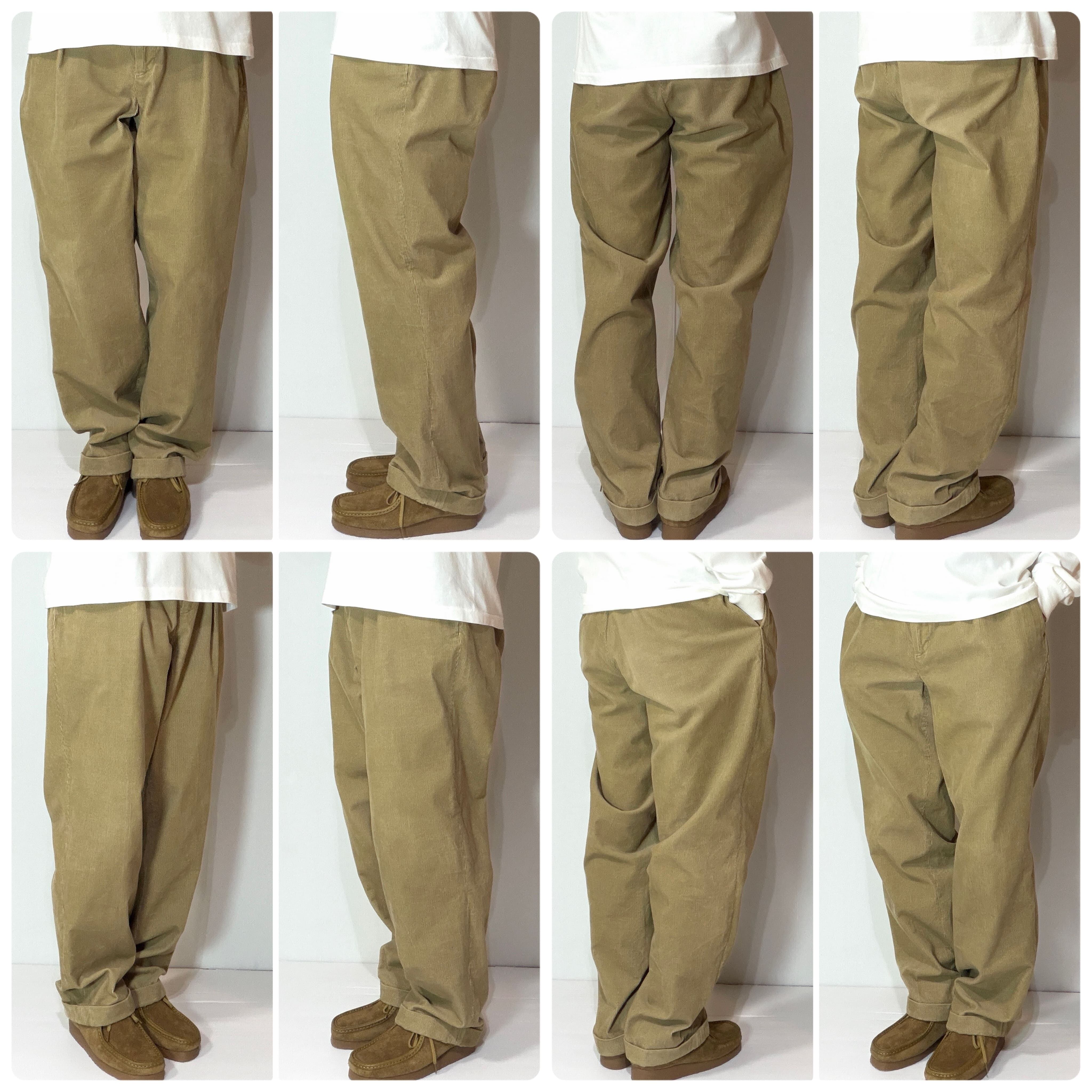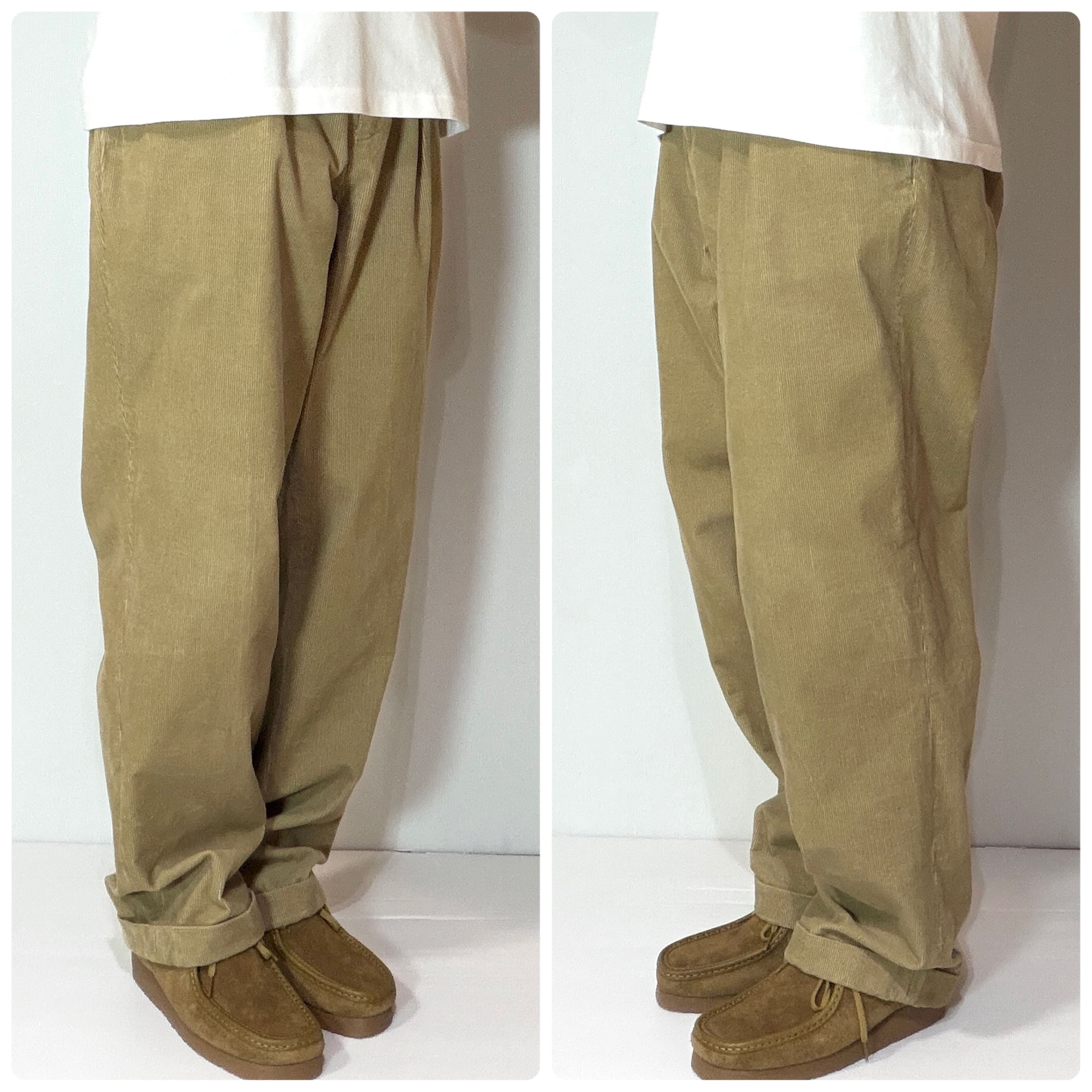 ・厚手で履きごたえのあるしっかりとしたコットン100%の細畝コーデュロイ、深い股上で腰回りやワタリ幅はゆったりとしたゆるくテーパードのかかったワイドストレートシルエット
