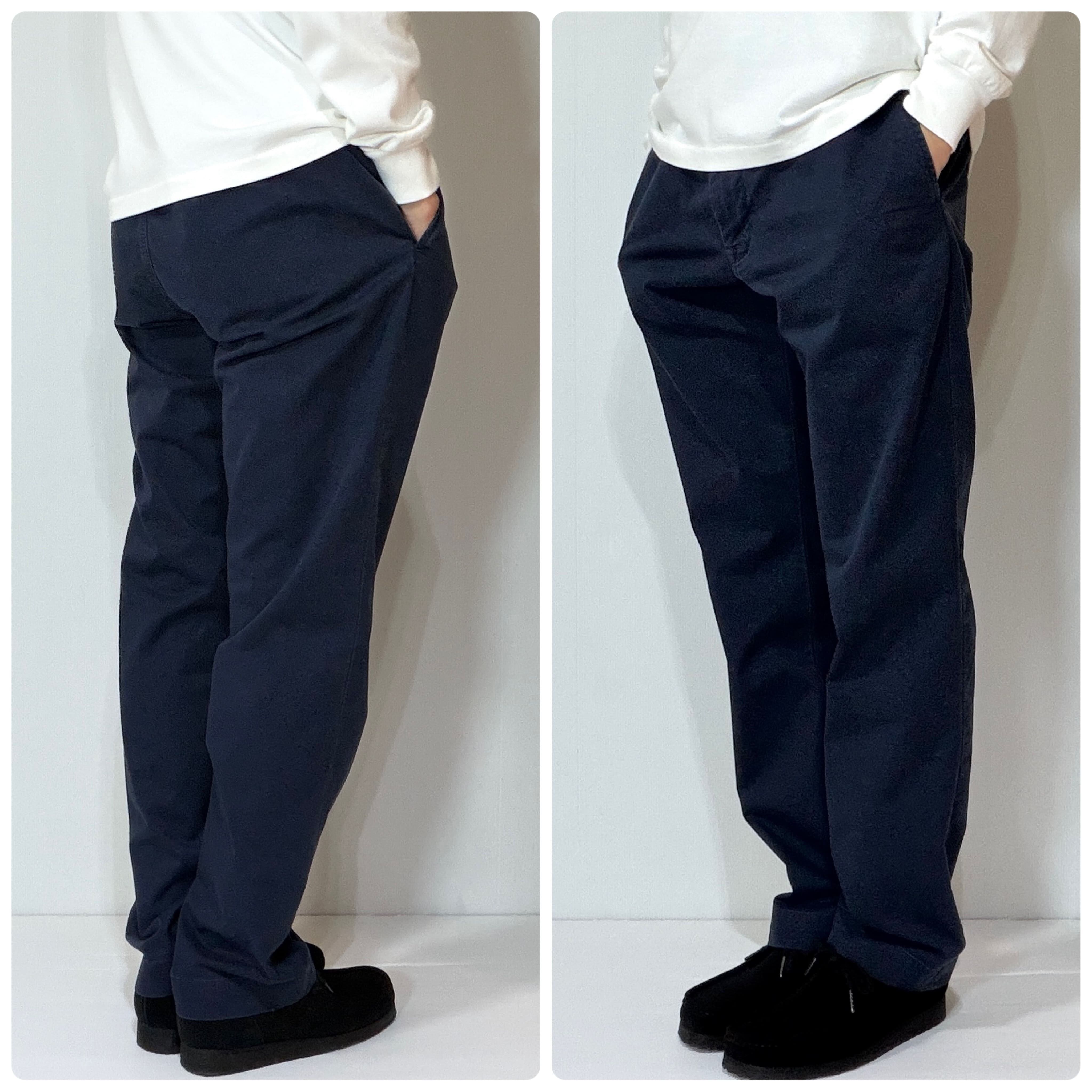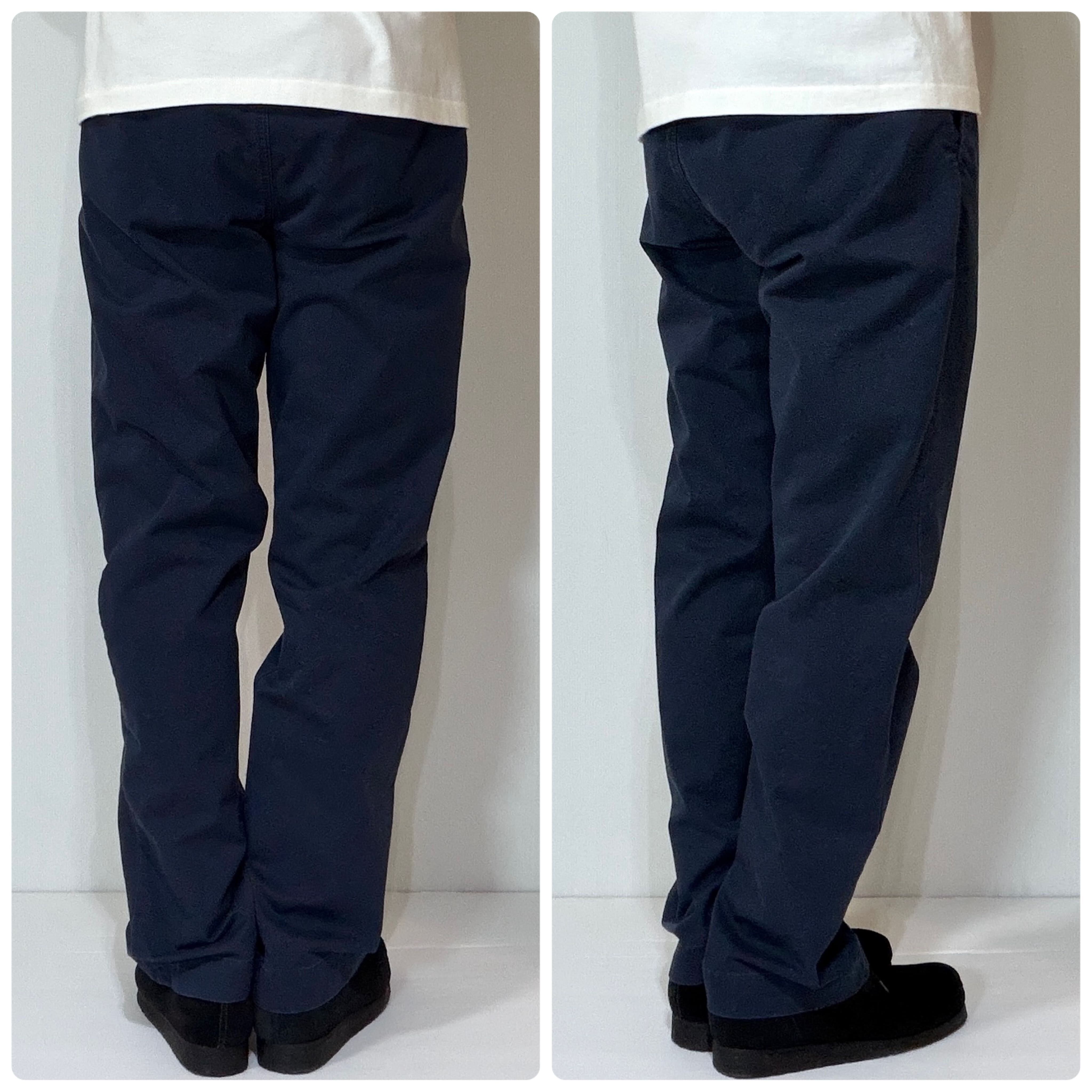 ・着用モデル176cm65kgでウエストはベルトで絞って、レングスはやや裾に溜めて細すぎず太すぎず、ゆったりしながらもすっきりとしたシルエットで着用できるサイズ感です。