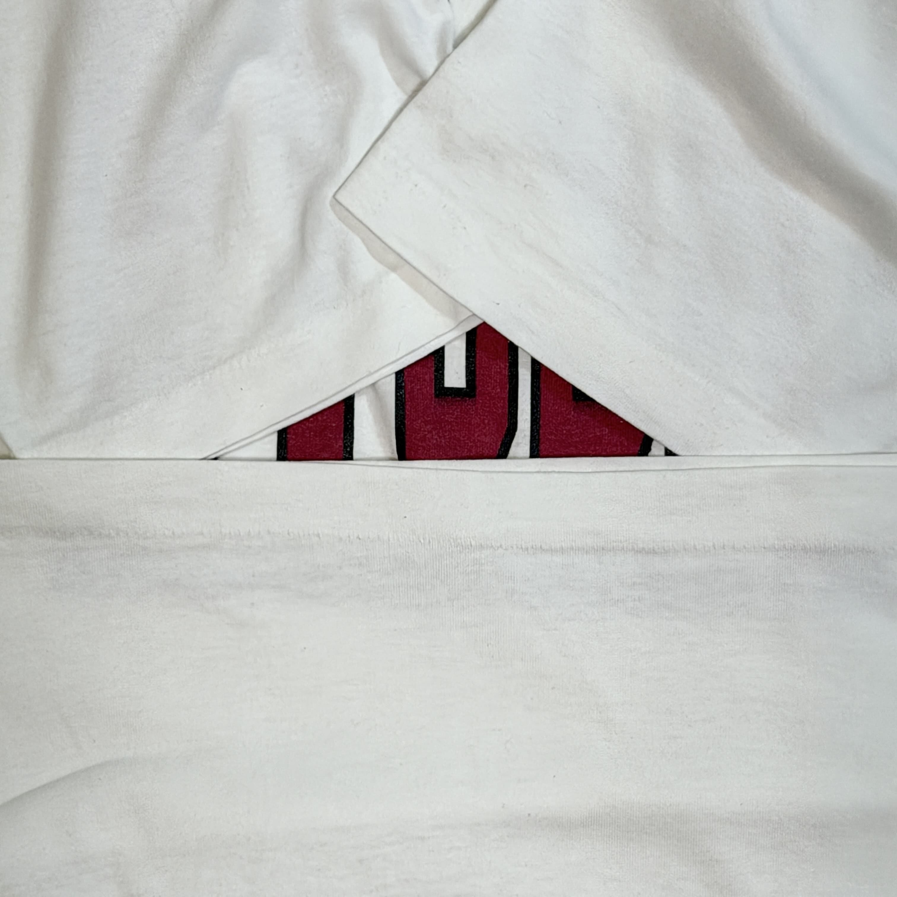 ・柔らかい肌触りで速乾性に優れたやや肉厚のポリコットンのフルーツBESTボディ、丸胴の首袖裾シングルステッチ、フロントは大判のカレッジプリントでバックプリントは音符モチーフの年号入りのデザイン、ホワイトボディにジョーダン1のシカゴカラーのような配色が映える一枚