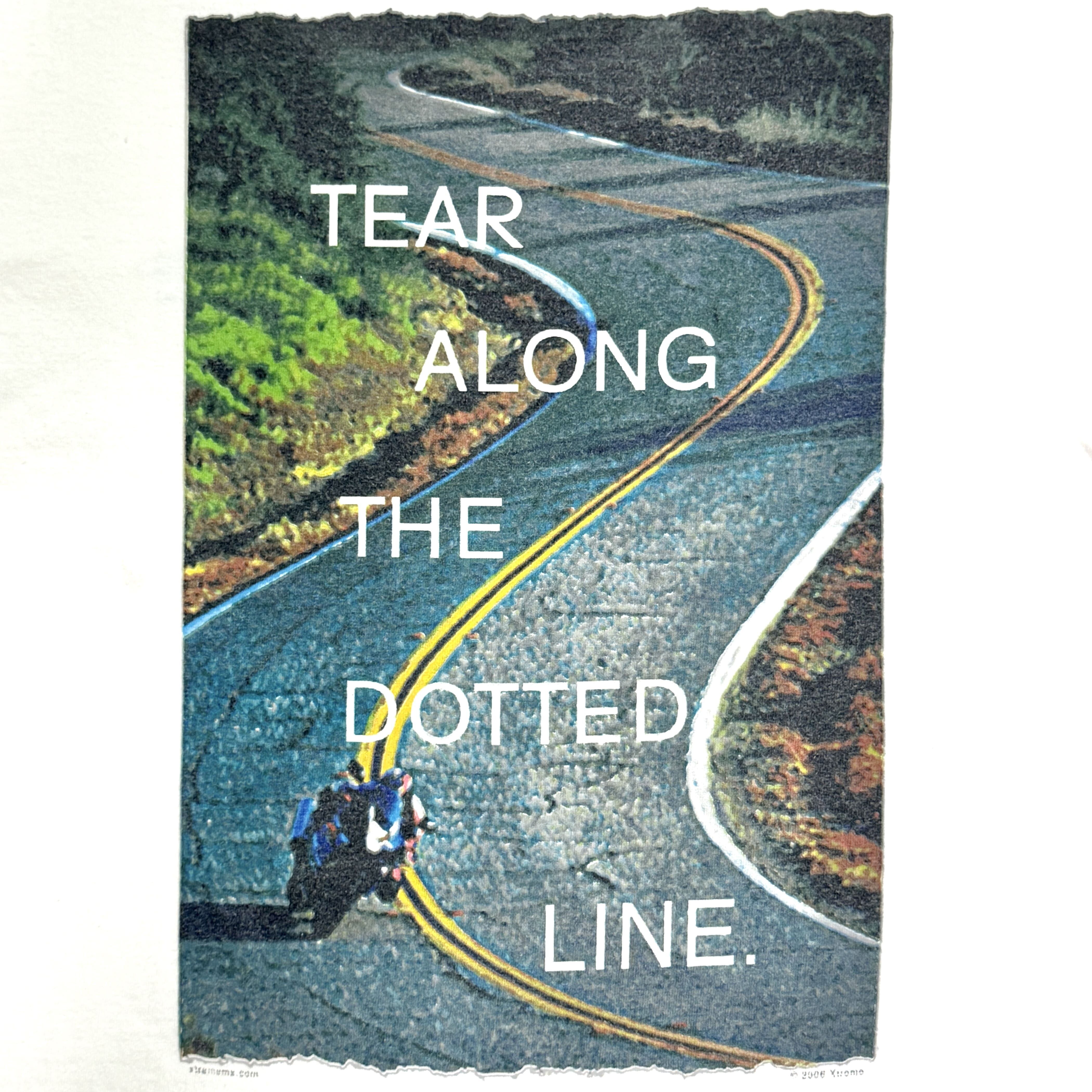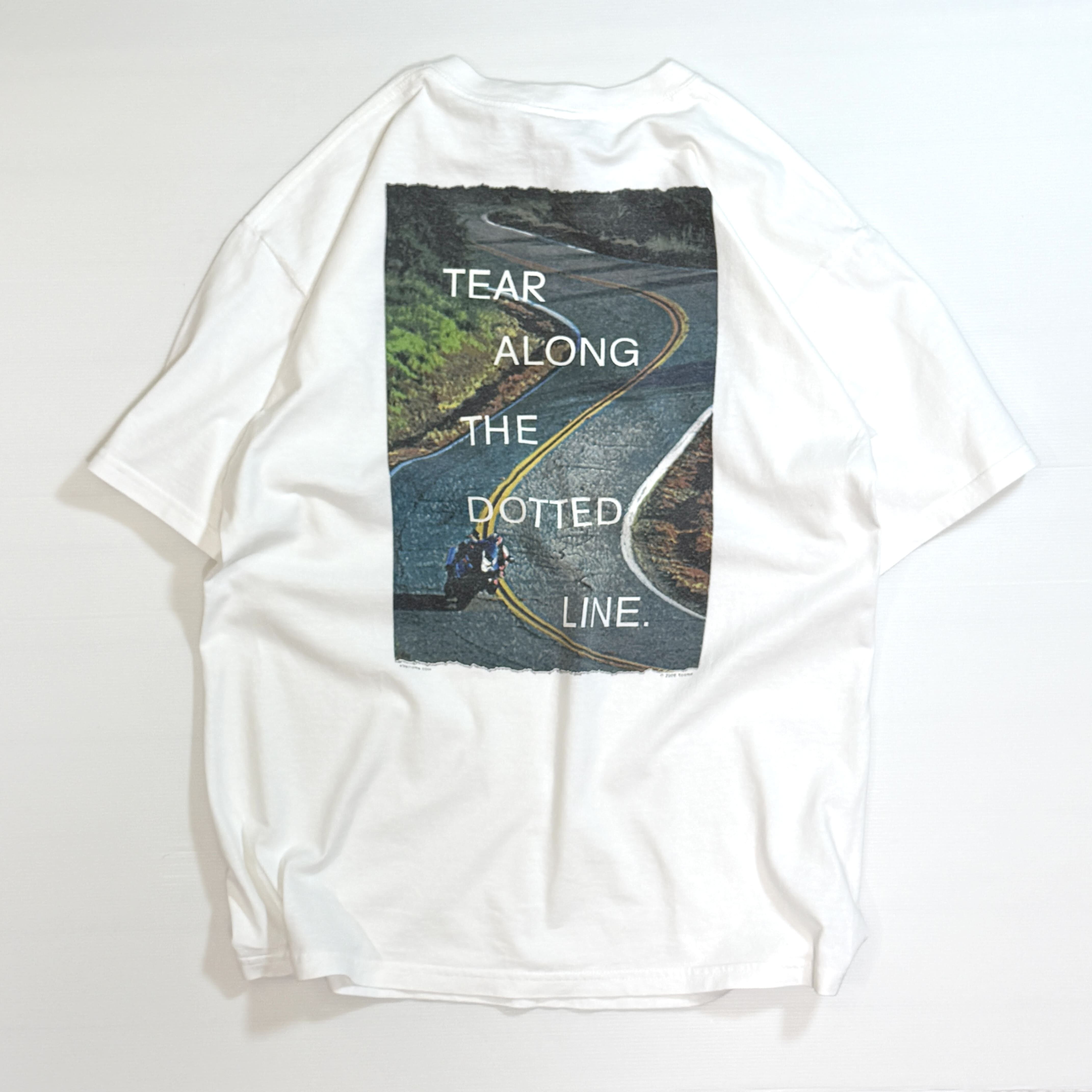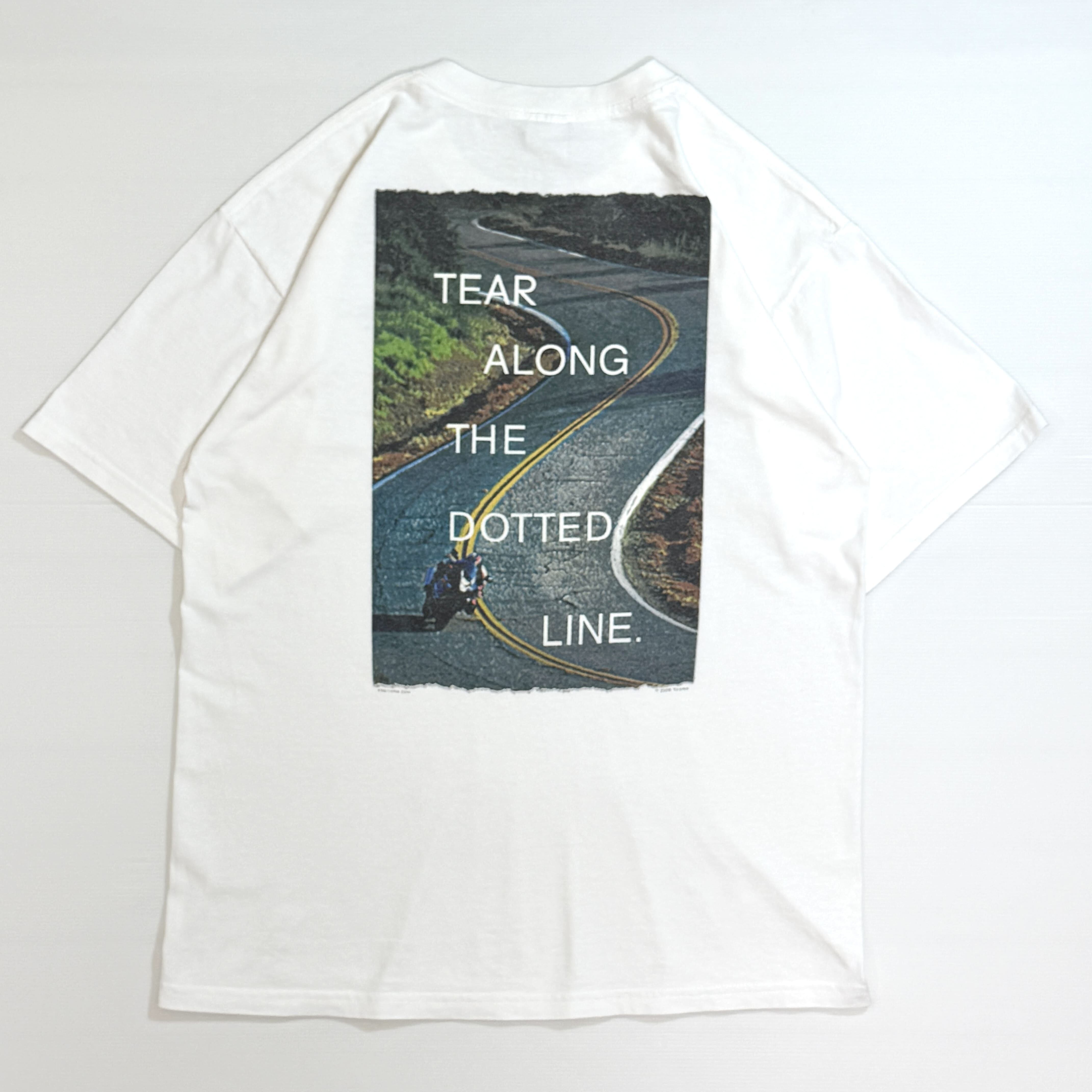 ・フロントは胸元にブランドロゴと「life's too short not to be.(人生は短すぎるから)」ブランドの定番スローガンのプリント、バックはワインディングロード(峠道)を走るライダーのフォトプリントに「TEAR ALONG THE DOTTED LINE.(点線に沿って切り取ってください)」 という、切り取り線と道路のセンターラインを掛け合わせたメッセージプリント、シンプルでインパクトもあり一枚でもしっかりきまるグラフィックです。