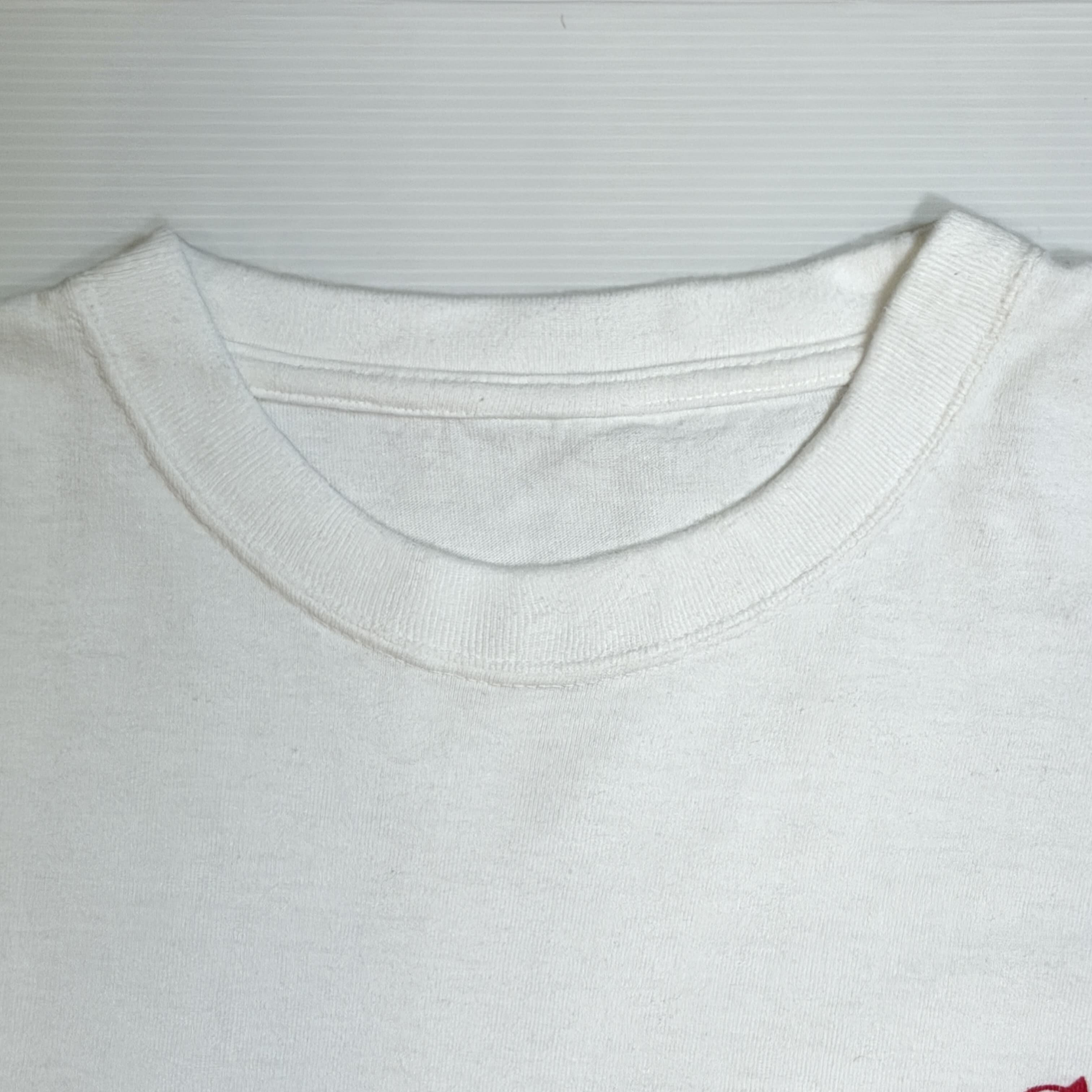 ・タグ欠損ですが一般的なヘビーウェイトのTシャツより一回り厚手のコットンの生地感で丸胴の裾袖シングルステッチ、おそらくSCREEN STARS(スクリーンスターズ) か Fruit of the Loom(フルーツオブザルーム) の米国製ボディのものと思われます。