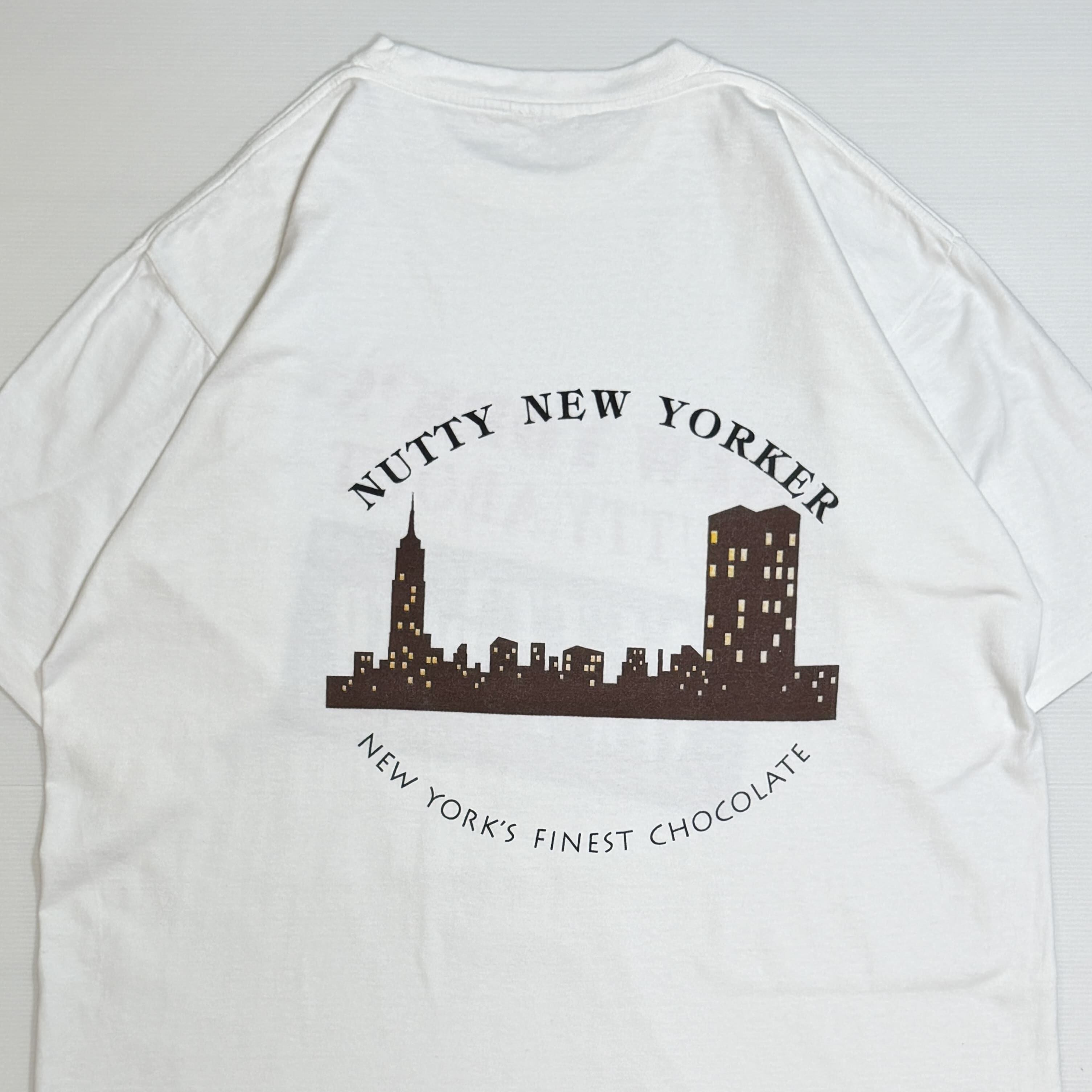 90s NUTTY NEW YORKER CHOCOLATE double-sided big print heavy weight crew neck Vintage S/S T-SHIRT【XL相当】【ホワイト/白/WHITE】ナッティー ニューヨーカー 両面プリント ヴィンテージ 企業ロゴ スーベニア Tシャツ NY ニューヨーク お土産 シングルステッチ ヘビーウェイト 超厚手 コットン 半袖 Tee トップス カットソー アメリカ買付 お菓子 チョコレート 1990年代 p26043580
