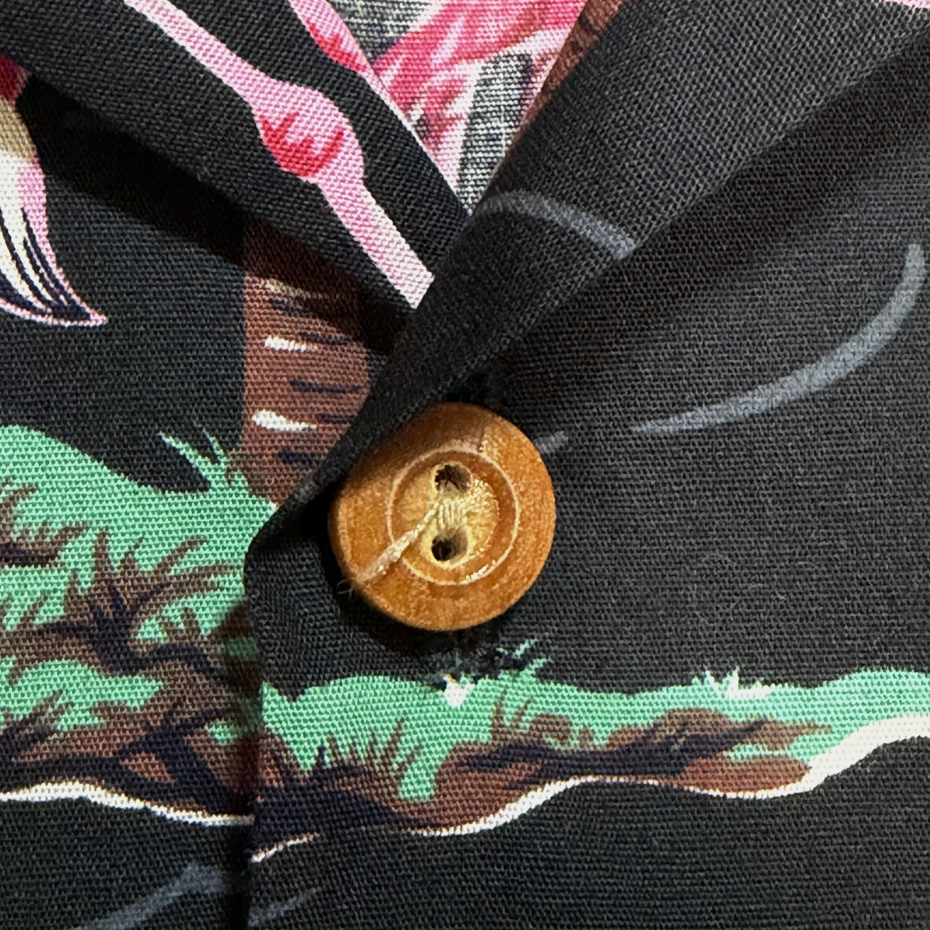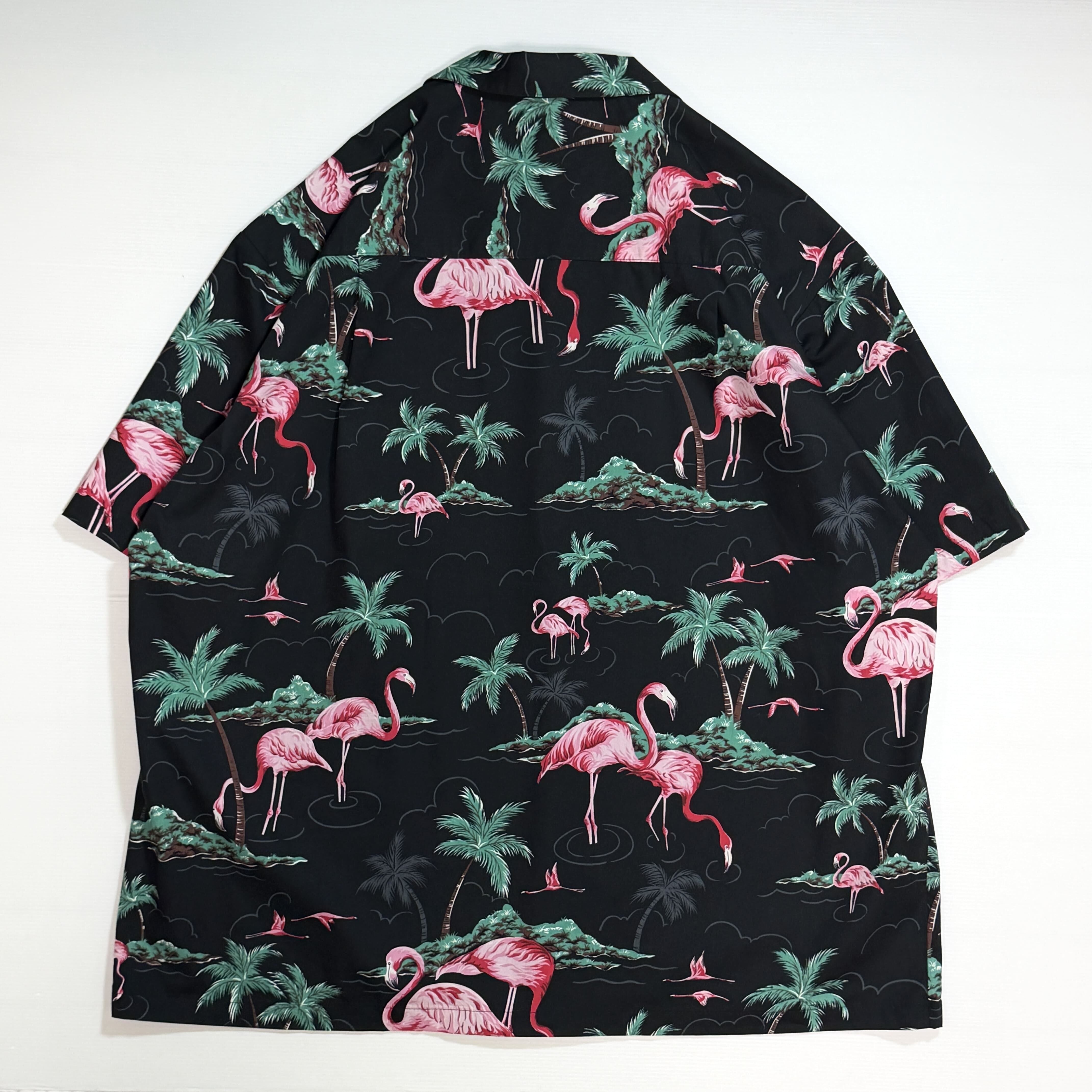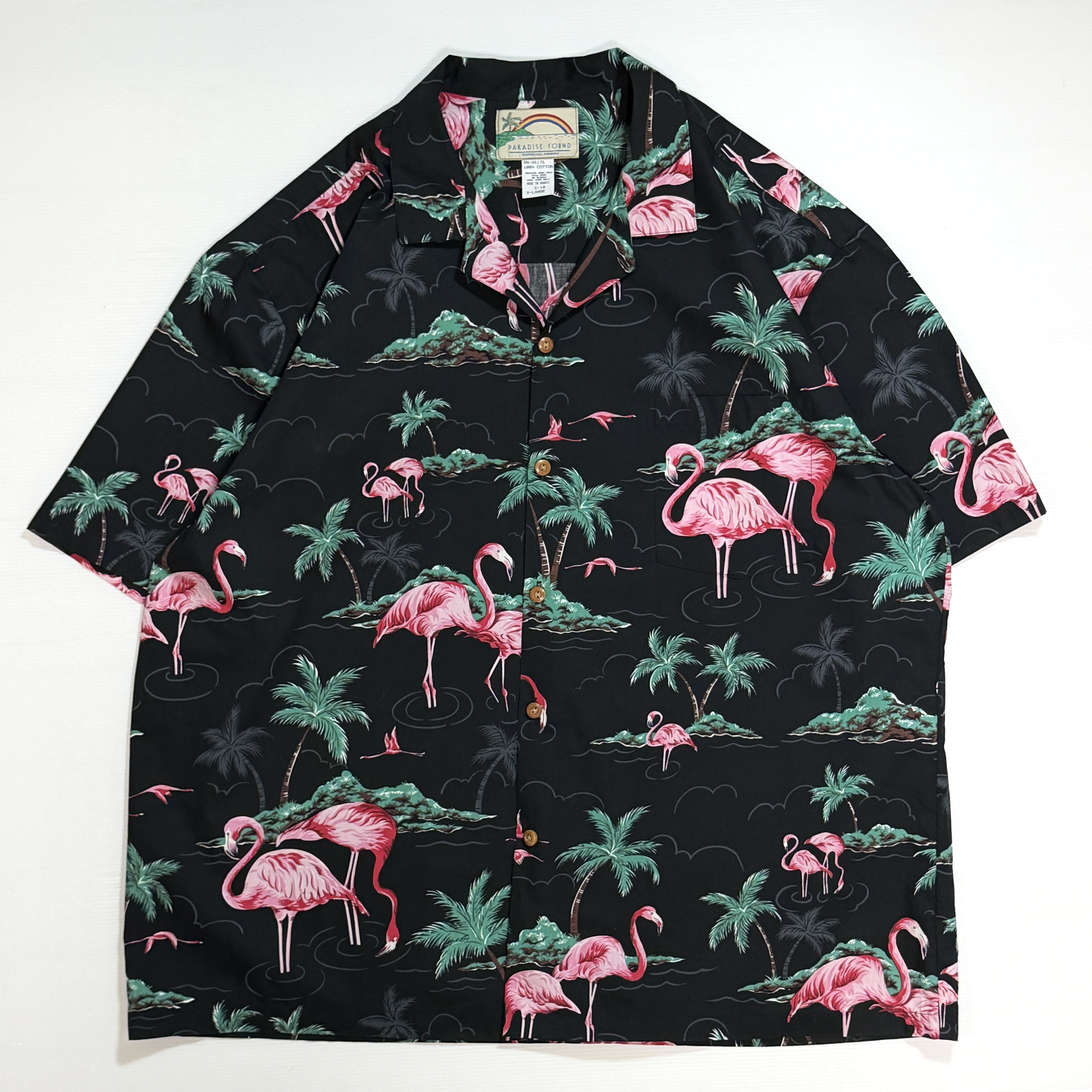 ほぼデッド 80s~90s PRADISE FOUND Flamingo print s/s open-collar aloha shirt made in HAWAII【XL】【ブラック/黒/BLACK】ハワイ製 パラダイス ファウンド フラミンゴ 総柄プリント 半袖 オープンカラー ハワイアン アロハシャツ レギュラーヴィンテージ アメリカ買付 花柄 ヤシの木ボタニカル 超美品 ブラックフラミンゴ ボックスシルエット p26043566
