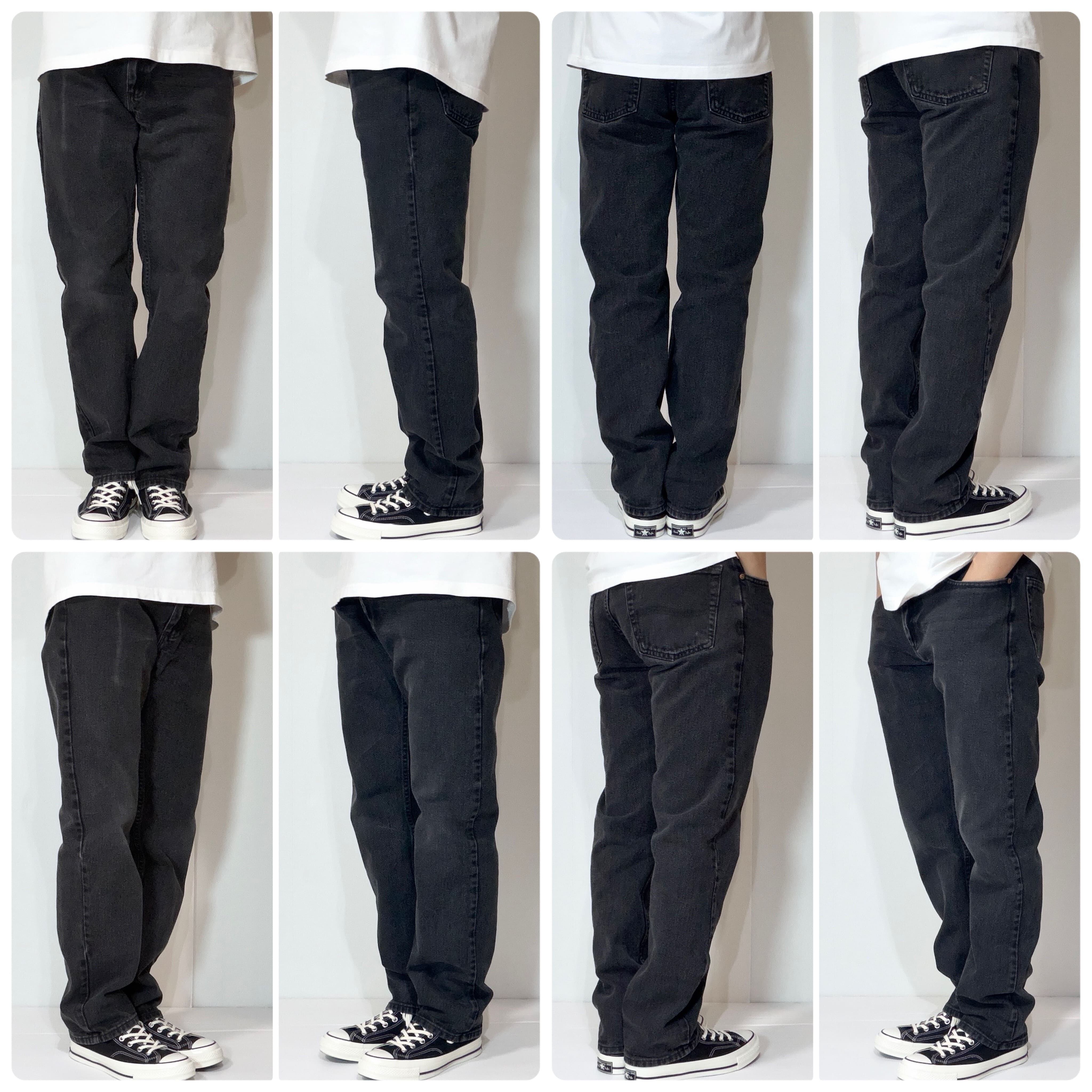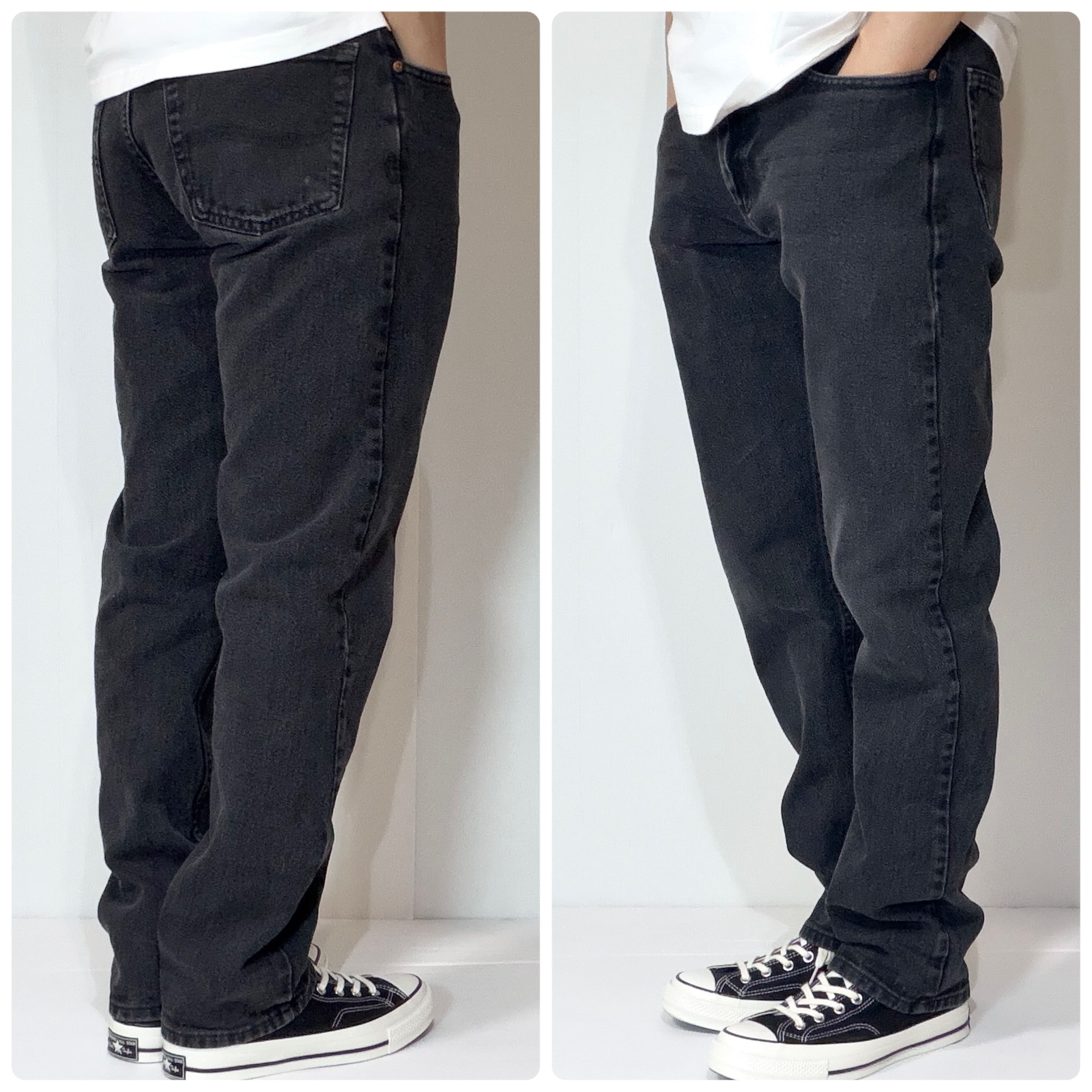 ・ヘビーオンスの厚手の生地感の先染めのブラック、やや浅めの股上で王道ストレートシルエット「101」のモデルに近いモデルです。